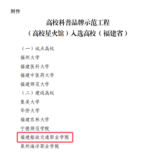 近日,在中國科協(xié)組織實施的“高??破掌放剖痉豆こ蹋ǜ咝P腔痧^)”評選中,我院入選項目建設(shè)高校。學(xué)院申報的“星火館”項目,充分發(fā)揮職業(yè)院校實訓(xùn)資源優(yōu)勢,重點涵蓋航海技術(shù)、交通安全、交通土建、軌道交通、航空、增材制造、新能源汽車、信息技術(shù)等8個領(lǐng)域的科普及實驗實訓(xùn)基地。