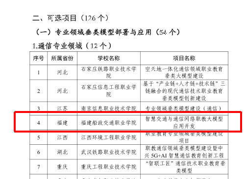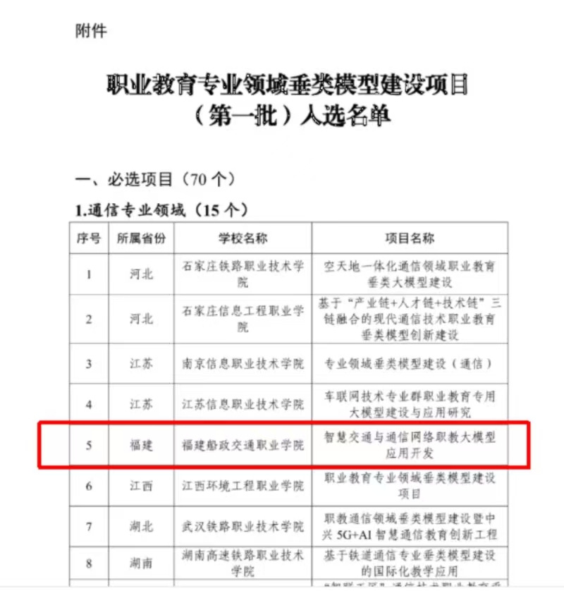 近日,教育部職業(yè)教育發(fā)展中心公布了“職業(yè)教育專業(yè)領(lǐng)域垂類模型建設(shè)項目(第一批)”入選名單,由我院信息與智慧交通學(xué)院團隊申報的“智慧交通與通信網(wǎng)絡(luò)職教大模型應(yīng)用開發(fā)”項目成功入選,成為通信專業(yè)領(lǐng)域重點建設(shè)項目之一。