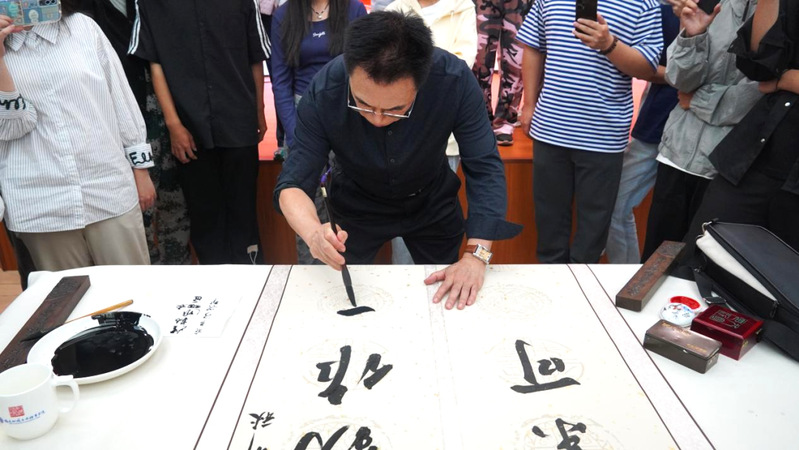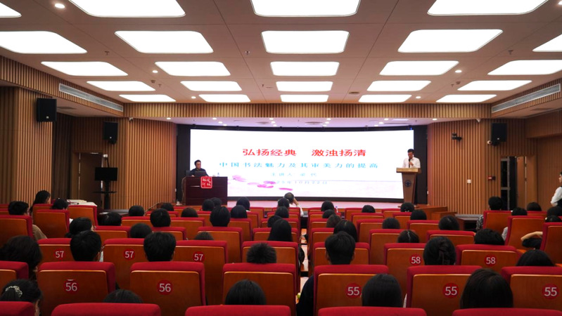 講座中,梁代教授以個人成長與書法結(jié)緣的經(jīng)歷為引,講述他從孜孜求學(xué)的學(xué)子成長為推動中華優(yōu)秀傳統(tǒng)文化海外傳播“書法文化使者”的奮斗歷程,并結(jié)合經(jīng)典作品與自身創(chuàng)作實踐,細(xì)致講解了執(zhí)筆、“用筆”的千古不易之法則,呼吁更多的書法愛好者從自身做起,提升審美,堅守傳統(tǒng),從筆墨中體悟“剛健有為”“虛實相生”的東方智慧。他還鼓勵青年學(xué)子錘煉技藝、修煉品格、涵養(yǎng)心靈,樹立遠(yuǎn)大理想,在擔(dān)當(dāng)中歷練,在盡責(zé)中成長,爭做“有理想、敢擔(dān)當(dāng)、能吃苦、肯奮斗”的新時代青年。