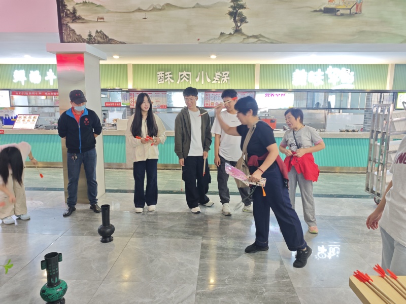活動(dòng)當(dāng)日,校園內(nèi)處處洋溢著溫馨氛圍,“歡樂(lè)重陽(yáng)”趣味健身游園會(huì)將傳統(tǒng)民俗與趣味體驗(yàn)巧妙融合,讓老同志們?cè)诨?dòng)中盡享歡樂(lè)。在制作漆扇區(qū),老師們手持素扇放入漆桶輕輕轉(zhuǎn)動(dòng),暈染出靈動(dòng)紋路,讓樸素的扇面瞬間綻放出獨(dú)特光彩;干花香囊制作區(qū)里,老師們挑選心儀的干花與香料,親手縫制出一個(gè)個(gè)精致的香囊;投壺與捶丸項(xiàng)目前更是熱鬧非凡,老同志們或凝神瞄準(zhǔn)、穩(wěn)步投箭,或手持球桿、精準(zhǔn)擊球,現(xiàn)場(chǎng)時(shí)而響起歡呼喝彩,盡顯活力與風(fēng)采。隨后,學(xué)院組織離退休教師集體觀看電影,從影片中傳遞關(guān)懷。