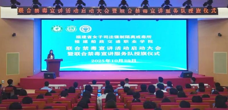 近日,我院與福建省女子司法強制隔離戒毒所聯(lián)合舉辦了禁毒宣講活動啟動大會暨聯(lián)合禁毒宣講服務隊授旗儀式。福建省司法廳戒毒管理局黨委委員、副局長李佐云,學院黨委副書記張輝,福建省女子司法強制隔離戒毒所副所長肖宏林,林則徐基金會秘書長林燕頤以及戒毒所民警、各二級學院黨總支書記、學生代表近三百人參加活動。