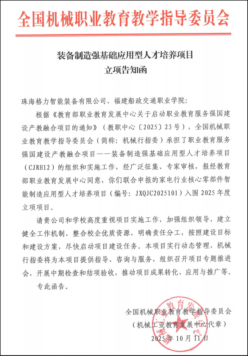 近日,全國機械職業(yè)教育教學指導委員會發(fā)布通知,我院聯(lián)合珠海格力智能裝備有限公司共同申報的“家電行業(yè)核心零部件智能制造應用型人才培養(yǎng)項目”入選職業(yè)教育服務強國建設產(chǎn)教融合項目——裝備制造強基礎應用型人才培養(yǎng)項目。