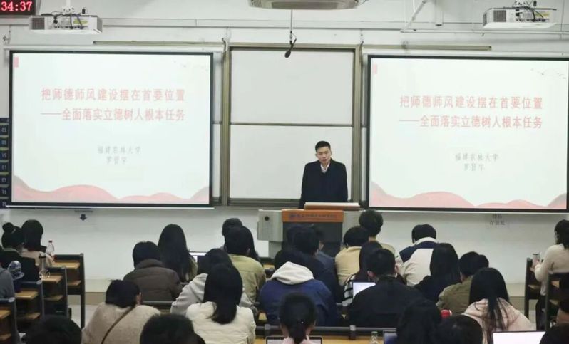 師德師風是教師隊伍建設的靈魂,福建農(nóng)林大學馬克思主義學院羅賢宇教授在《把師德師風建設擺在首要位置——全面落實立德樹人根本任務》專題講座中,報告深入解讀了新時代教師職業(yè)行為準則,結合典型案例,強調了筑牢師德底線、關愛學生成長、恪守學術道德的重要性。講座引導新教師們深刻思考“為誰培養(yǎng)人、培養(yǎng)什么人、怎樣培養(yǎng)人”這一根本問題,激勵大家爭做“四有”好老師,將立德樹人根本任務內化于心、外化于行。