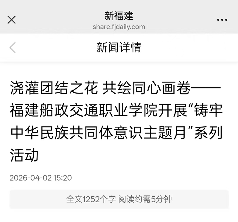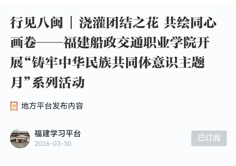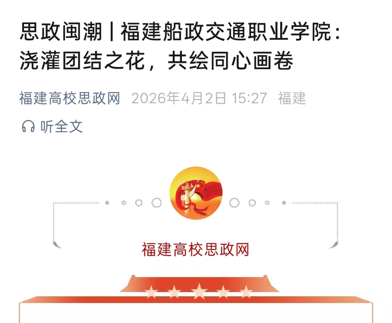 近日,學(xué)習(xí)強國福建學(xué)習(xí)平臺、福建高校思政網(wǎng)、新福建等主流媒體發(fā)布《澆灌團結(jié)之花 共繪同心畫卷——福建船政交通職業(yè)學(xué)院開展“鑄牢中華民族共同體意識主題月”系列活動》,報道學(xué)院圍繞“鑄牢中華民族共同體意識”主線,精心組織開展“鑄牢中華民族共同體意識主題月”系列活動?;顒娱_展以來,學(xué)院從座談交流、理論宣講、文化浸潤、實踐體驗、紅色教育五個維度精準(zhǔn)發(fā)力,組織全院師生廣泛參與、深度互動,進一步凝聚起中華民族一家親、同心共筑中國夢的強大合力。