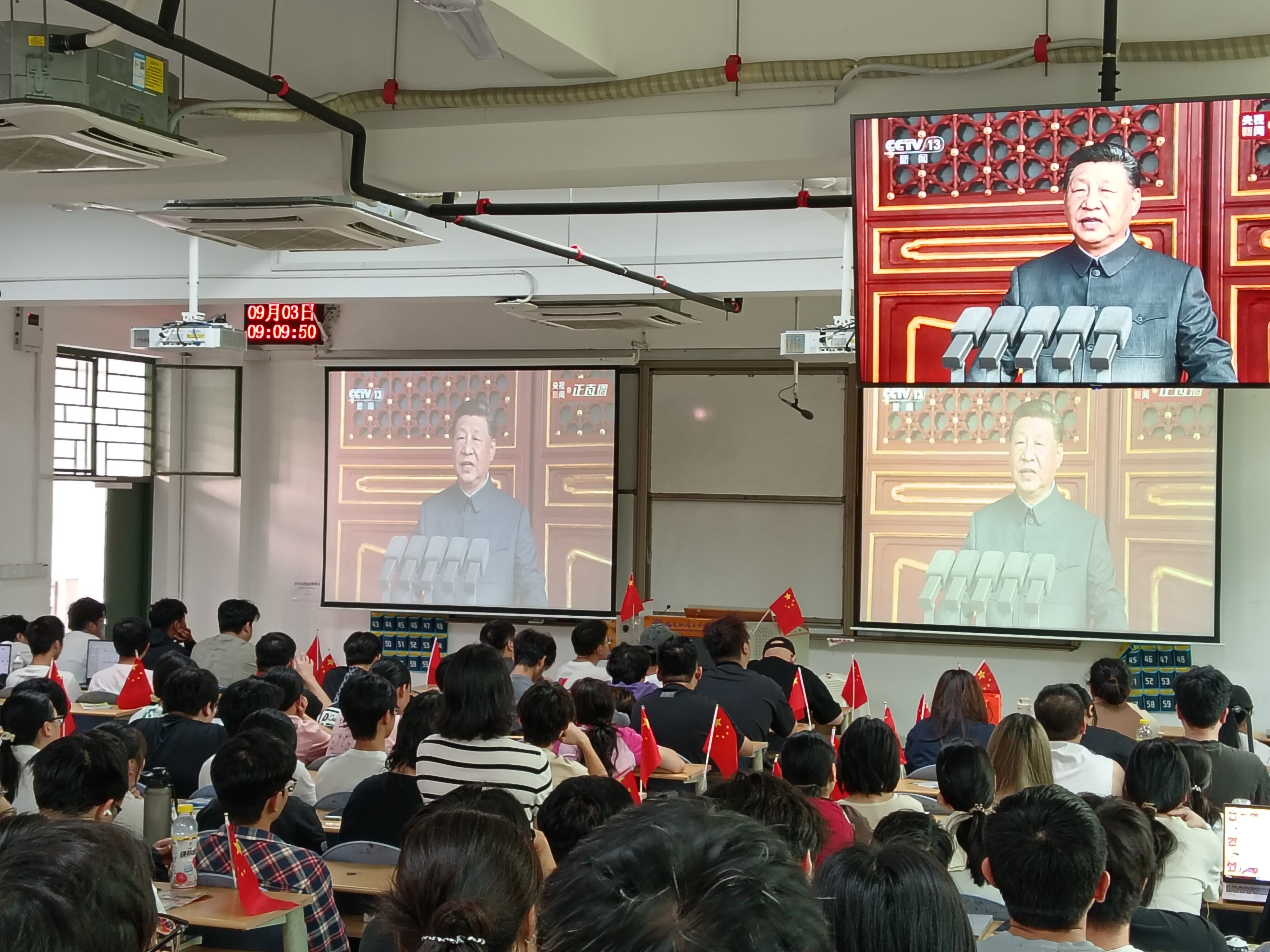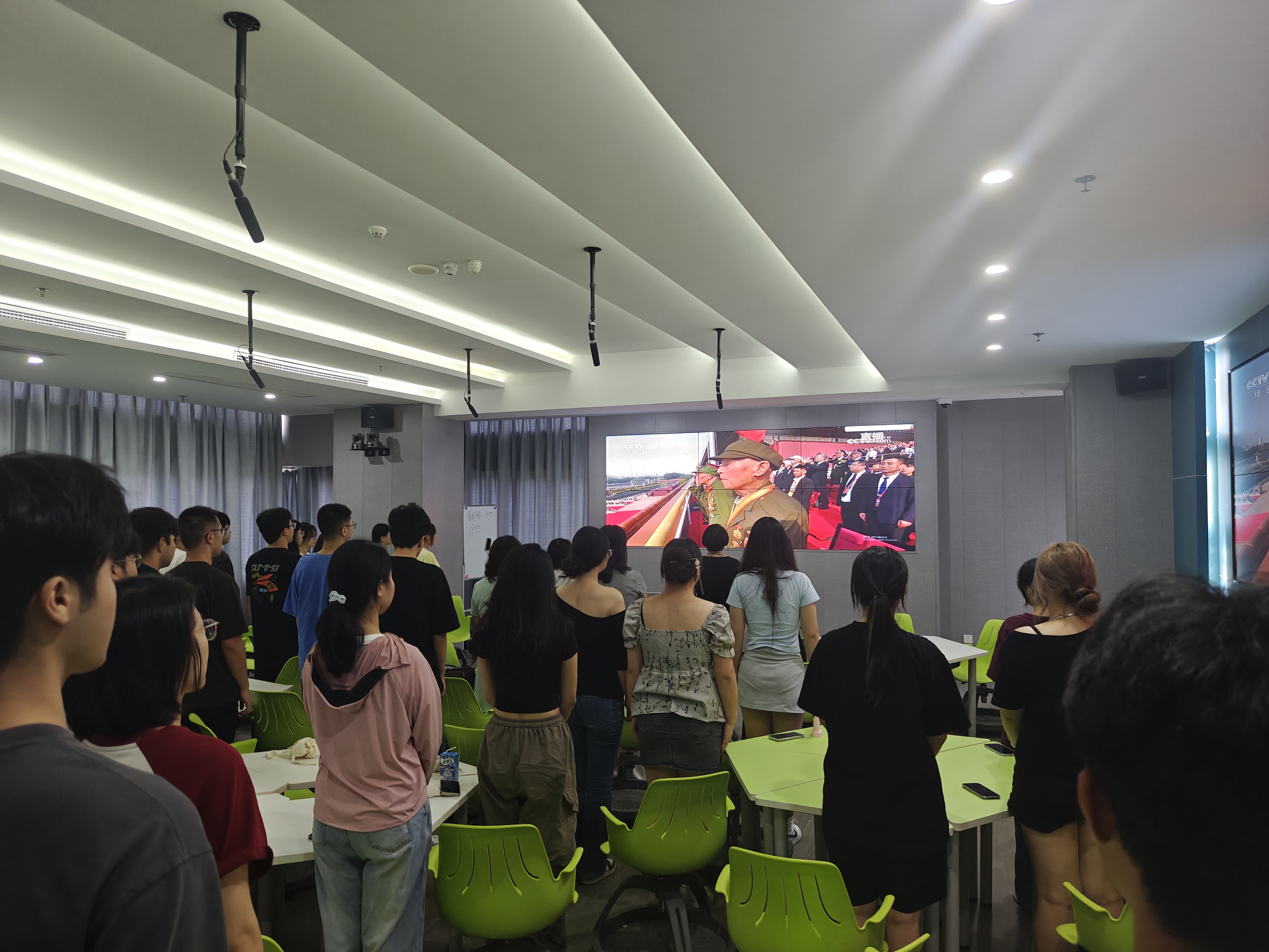 2025年9月3日,紀(jì)念中國人民抗日戰(zhàn)爭暨世界反法西斯戰(zhàn)爭勝利80周年,安全與環(huán)境學(xué)院組織全院師生集中收看了莊嚴(yán)盛大的九三閱兵式。學(xué)院在藝新樓二樓公共安全融合實訓(xùn)基地安全宣教室、各年級班級同步設(shè)立分會場,確保師生全員參與。閱兵式上,英姿颯爽的解放軍方陣、震撼人心的武器裝備展示以及鏗鏘有力的口號聲,讓現(xiàn)場師生深受感染,愛國熱情高漲。