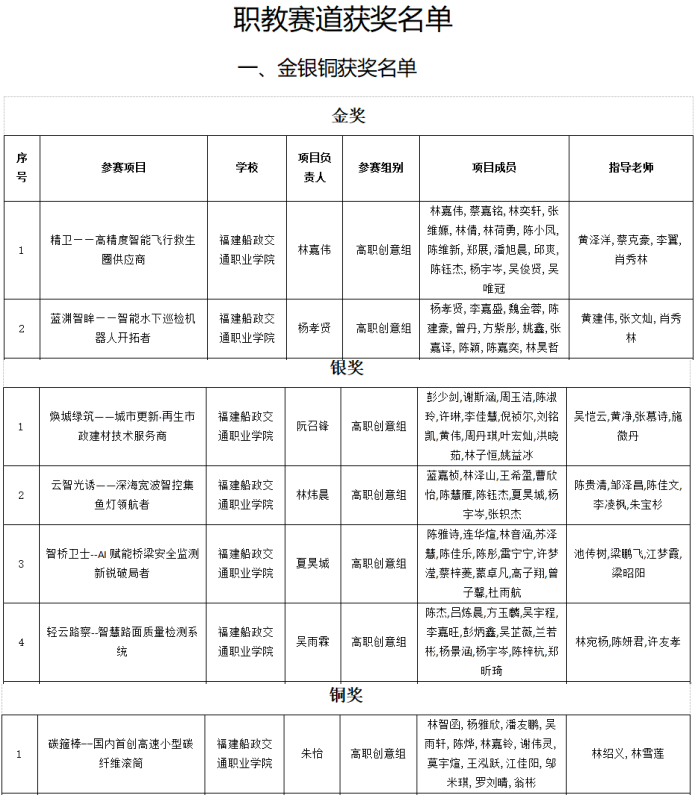 近日,根據(jù)“福建省教育廳關(guān)于公布福建省大學(xué)生創(chuàng)新大賽(2025)獲獎名單的通知(閩教高〔2025〕20號)”文件,我院在本屆大賽中榮獲2金6銀3銅的成績。其中,藍淵智眸——智能水下巡檢機器人開拓者和精衛(wèi)——高精度智能飛行救生圈供應(yīng)商兩個項目獲得福建省大學(xué)生創(chuàng)新大賽(2025)(職教賽道)金獎;砼筑綠夢——建筑垃圾多源骨料集約化智配平臺構(gòu)建與產(chǎn)業(yè)化應(yīng)用項目獲得產(chǎn)業(yè)命題賽道銀獎;石厝衛(wèi)士——海岸石厝民居文化守護者項目獲得高教主賽道銀獎。