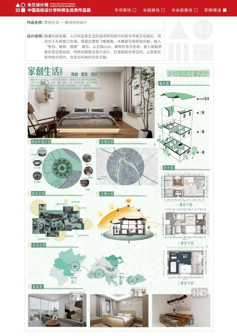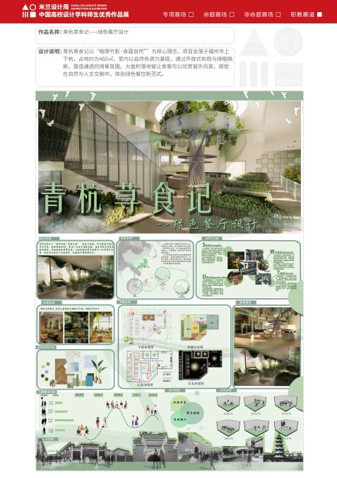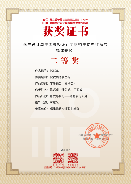 近日,由中國教育國際交流協(xié)會(huì)、中國高等教育學(xué)會(huì)聯(lián)合主辦的第九屆“米蘭設(shè)計(jì)周中國高校設(shè)計(jì)學(xué)科師生優(yōu)秀作品展”主題競(jìng)賽評(píng)審結(jié)果正式公布。學(xué)院建筑裝飾工程技術(shù)專業(yè)學(xué)生踴躍參賽并喜獲佳績(jī),共獲職教賽道非命題類福建賽區(qū)二等獎(jiǎng)1項(xiàng)、三等獎(jiǎng)1項(xiàng)。其中,作品《青杭蕁食記--綠色餐廳設(shè)計(jì)》榮獲二等獎(jiǎng),《家創(chuàng)生活——居住空間設(shè)計(jì)》榮獲三等獎(jiǎng)。
