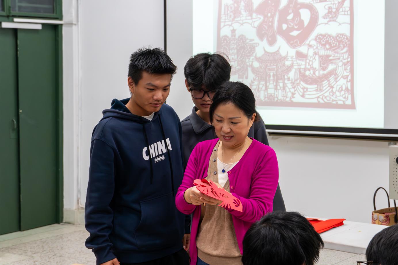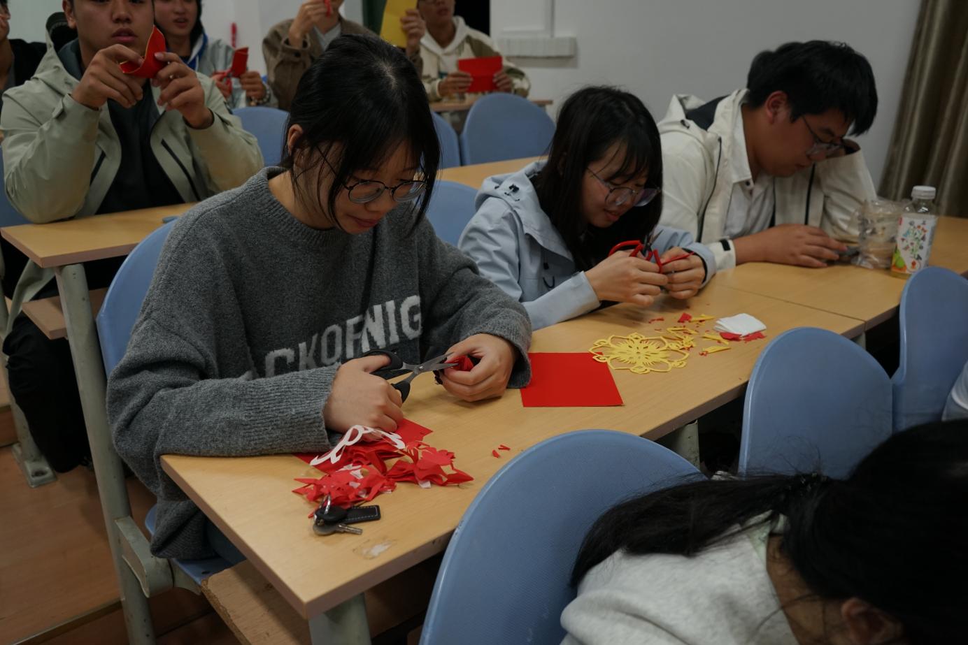 進入實踐創(chuàng)作環(huán)節(jié),董老師親自示范指導,耐心解答學生們的疑問。同學們熱情高漲、踴躍參與,紅紙在指尖翻飛,剪刀在紙上流轉(zhuǎn),一個個獨具巧思的圖案逐漸成型。