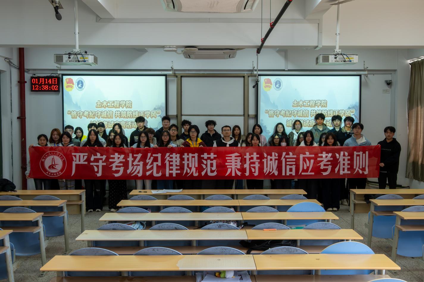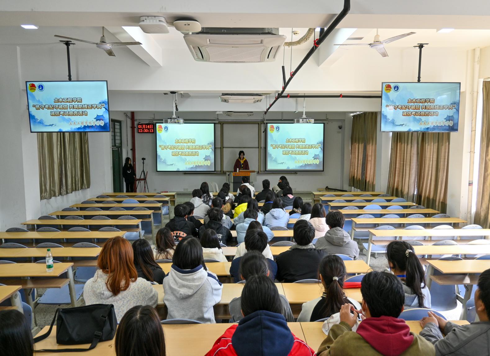 為深耕校園誠信文化土壤,培育同學(xué)們的誠信自覺意識(shí),激發(fā)大家踐行誠信品德的內(nèi)在動(dòng)力,打造風(fēng)清氣正的校園環(huán)境。2026年1月14日,土木工程學(xué)院于福船園創(chuàng)新樓302舉辦“恪守考紀(jì)守誠信 共筑防線正學(xué)風(fēng)”誠信考試宣言活動(dòng)。2024級(jí)、2025級(jí)學(xué)生代表參與本次活動(dòng)。