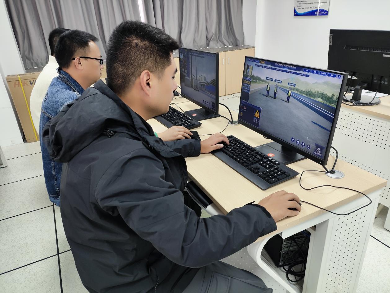學(xué)院充分發(fā)揮其在職業(yè)教育、尤其是交通建設(shè)領(lǐng)域安全培訓(xùn)方面的專業(yè)優(yōu)勢(shì)與資源整合能力,為培訓(xùn)及測(cè)評(píng)提供了強(qiáng)有力的技術(shù)平臺(tái)與組織實(shí)施保障。本次測(cè)評(píng)的核心亮點(diǎn)是采用了先進(jìn)的安全隱患排查虛擬仿真軟件。該軟件深度融合三維仿真技術(shù)與施工安全知識(shí),構(gòu)建了高度還原的施工現(xiàn)場(chǎng)虛擬環(huán)境,可模擬預(yù)制T梁運(yùn)輸與架設(shè)、橋面鋪裝施工、襯砌臺(tái)車作業(yè)、瀝青面層攤鋪等23項(xiàng)關(guān)鍵施工工序中潛藏的安全隱患。