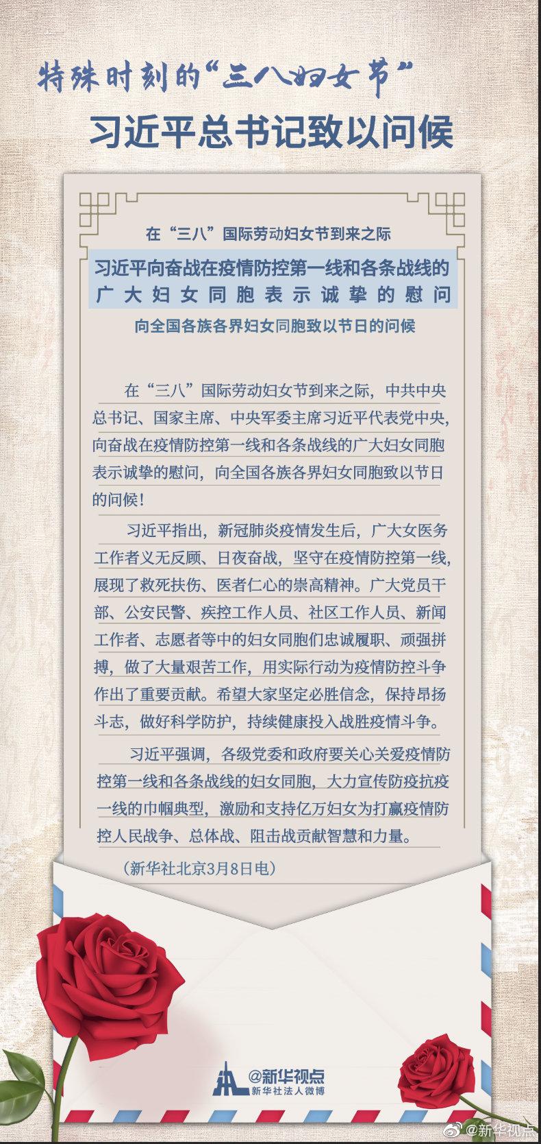 新華社北京3月8日電 在“三八”國際勞動婦女節(jié)到來之際,中共中央總書記、國家主席、中央軍委主席習(xí)近平代表黨中央,向奮戰(zhàn)在疫情防控第一線和各條戰(zhàn)線的廣大婦女同胞表示誠摯的慰問,向全國各族各界婦女同胞致以節(jié)日的問候!