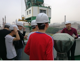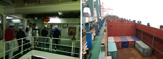 圖11 參觀機(jī)艙 圖12 觀看裝卸船作業(yè)