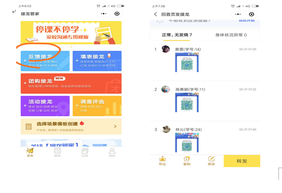 交通經(jīng)濟(jì)系張美嬋老師推薦了微信“接龍管家”,點(diǎn)擊所需的模板,即可在相關(guān)微信群一鍵發(fā)布疫情篩查上報(bào)內(nèi)容,將學(xué)生目前是否在家,是否發(fā)燒,是否接觸武漢等疫情高發(fā)地人員,近期是否返榕等文字反饋信息與閩政通八閩健康碼的截圖反饋輕松結(jié)合,讓學(xué)生遵照模板填寫。