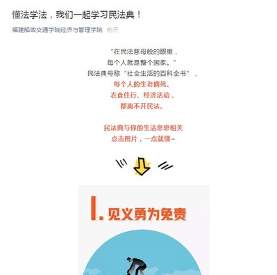 在“引”上做文章,“吹響”宣傳發(fā)動(dòng)的號(hào)聲。通過(guò)微信群,微信公眾號(hào)等新媒體平臺(tái),推送有關(guān)《民法典》解讀等內(nèi)容,以多元化方式多渠道進(jìn)行宣傳,做到讓宣傳推廣“跑起來(lái)”,讓學(xué)院師生對(duì)《民法典》有了初步的了解,引導(dǎo)師生要做學(xué)習(xí)、遵守、維護(hù)《民法典》的表率。