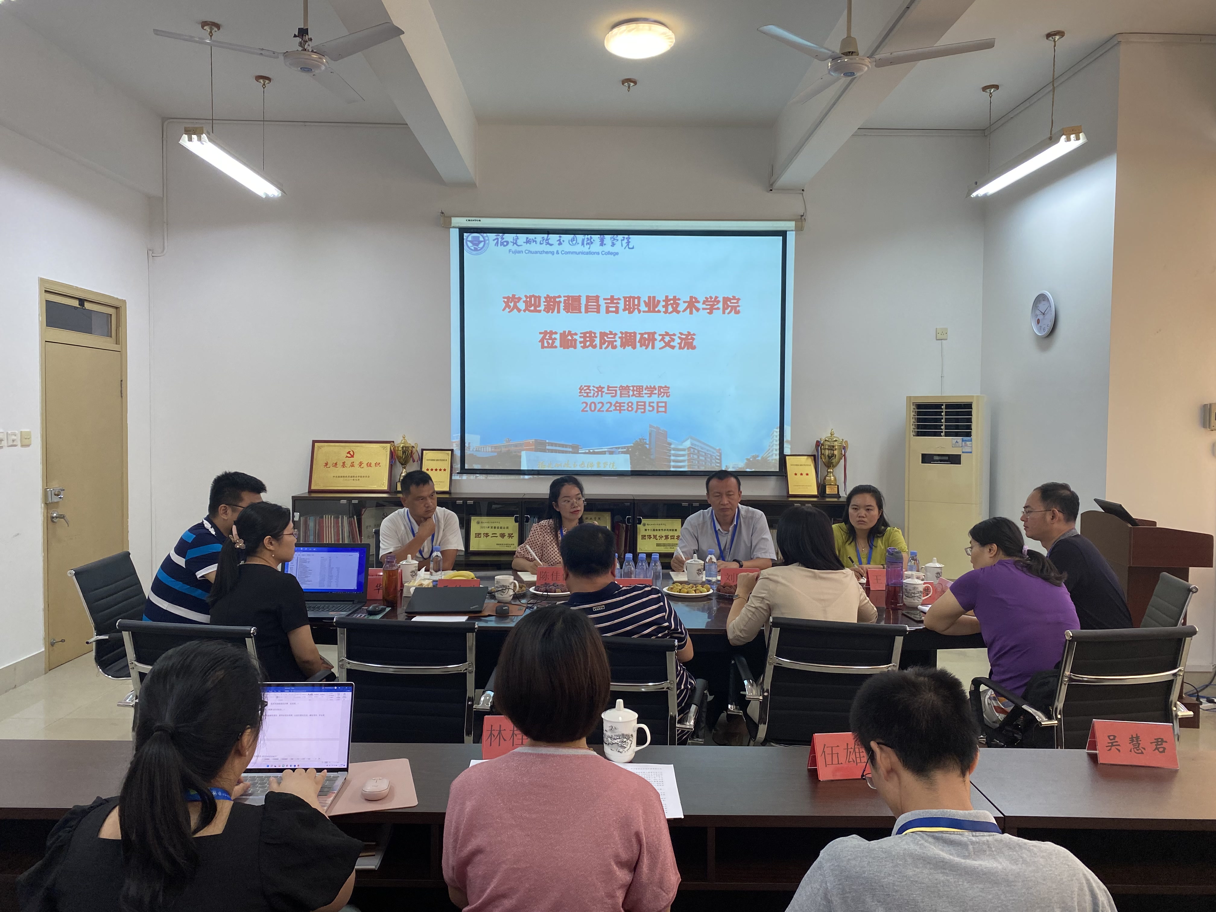 2022年8月5日上午,新疆昌吉職業(yè)技術(shù)學院經(jīng)管分院劉鵬飛書記、陳佳佳副院長一行4人到我院調(diào)研交流。我院吳吉明副院長、林穎副院長、各教研室主任、專業(yè)帶頭人、骨干教師等出席座談會。