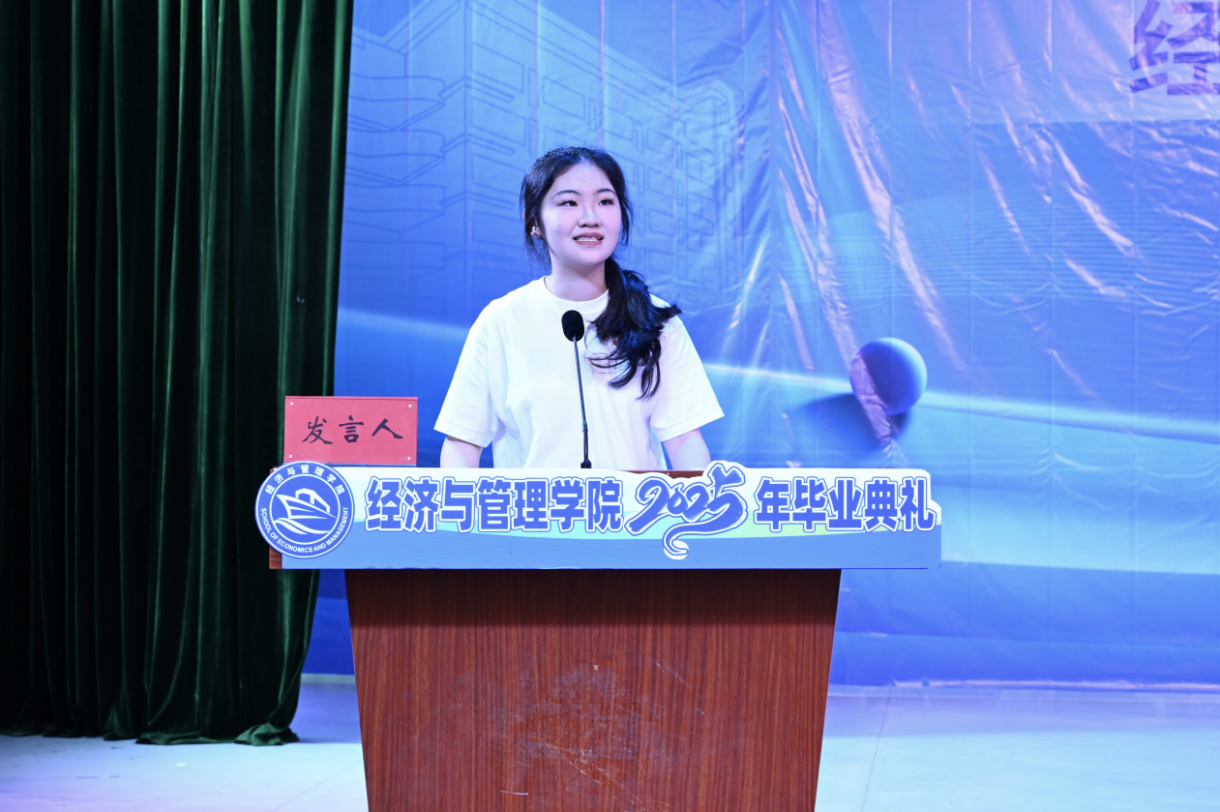 畢業(yè)生代表汪煜茹在發(fā)言中深情回顧了三年的求學歷程。她從初入校園的懵懂無知講起,講述了自己與同學們攜手奮斗、共同成長的點點滴滴,表達了對老師悉心教導和學院精心培育的感恩之情。展望未來,她目光堅定,承諾將永葆進取之心,在新征程中不斷突破自我,讓青春在奮斗中綻放光芒。同時,她也鼓勵同學們無畏挑戰(zhàn),持續(xù)錘煉本領,堅守初心,以昂揚的姿態(tài)奔赴遠方,用拼搏和汗水繪就精彩人生。
