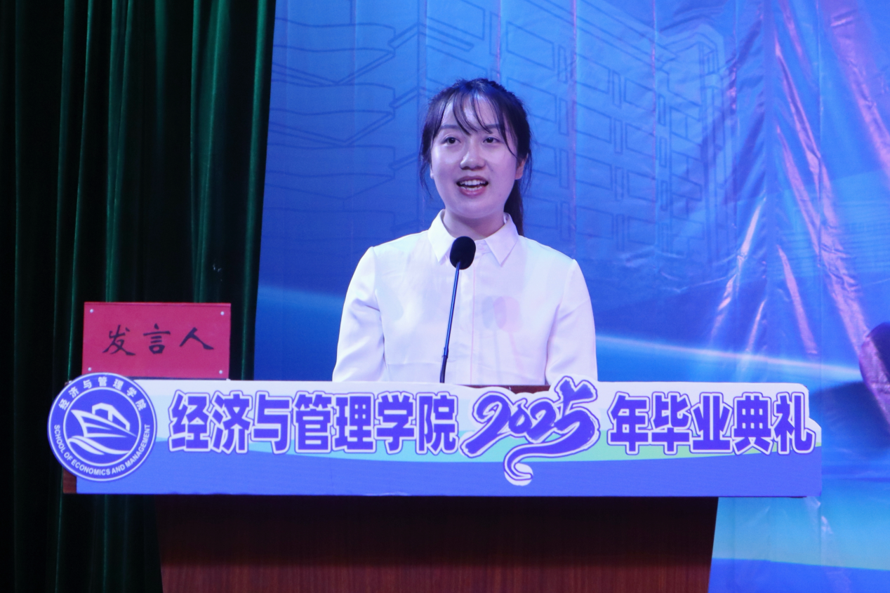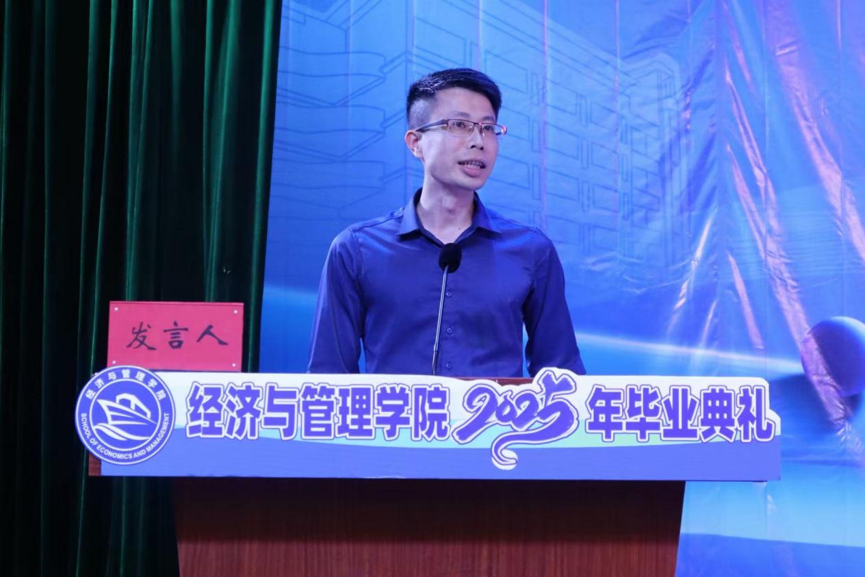 優(yōu)秀教師代表陳邯老師向2025屆畢業(yè)生深情寄語。希望大家以專業(yè)所長服務社會,又能以人文情懷溫暖他人;既能在平凡崗位中追求卓越,也能在時代浪潮中堅守初心。并對畢業(yè)生提出三點期望:一是“志不求易者成,事不避難者進”:愿你們永遠保持“船政人”敢為人先的銳氣;在時代的浪潮中書寫屬于經(jīng)管人的華章;二是“知者不惑,仁者不憂,勇者不懼”:愿你們在數(shù)字化浪潮中始終葆有人文溫度;三是“此去星辰大海,歸來仍是船政少年”:無論你們走向何方,母校的燈塔永遠為你們照亮歸航的路。