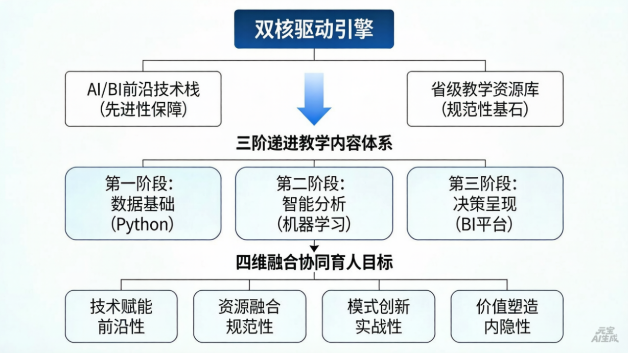 《大數(shù)據(jù)財(cái)務(wù)分析》是經(jīng)濟(jì)與管理學(xué)院面向大數(shù)據(jù)與會(huì)計(jì)專業(yè)打造的前沿課程,旨在培養(yǎng)能夠運(yùn)用Python數(shù)據(jù)分析、機(jī)器學(xué)習(xí)與BI可視化等技術(shù)解決復(fù)雜財(cái)務(wù)問(wèn)題的復(fù)合型人才。課程構(gòu)建了“數(shù)據(jù)基礎(chǔ)→智能分析→決策呈現(xiàn)”的全鏈路教學(xué)體系,深度融合了學(xué)院建設(shè)的統(tǒng)計(jì)與會(huì)計(jì)核算省級(jí)專業(yè)教學(xué)資源庫(kù)的優(yōu)質(zhì)資源,并將數(shù)據(jù)合規(guī)、誠(chéng)信意識(shí)、ESG理念等思政元素有機(jī)融入教學(xué)全過(guò)程,形成了“技術(shù)賦能、資源融合、模式創(chuàng)新、價(jià)值塑造”的鮮明特色。