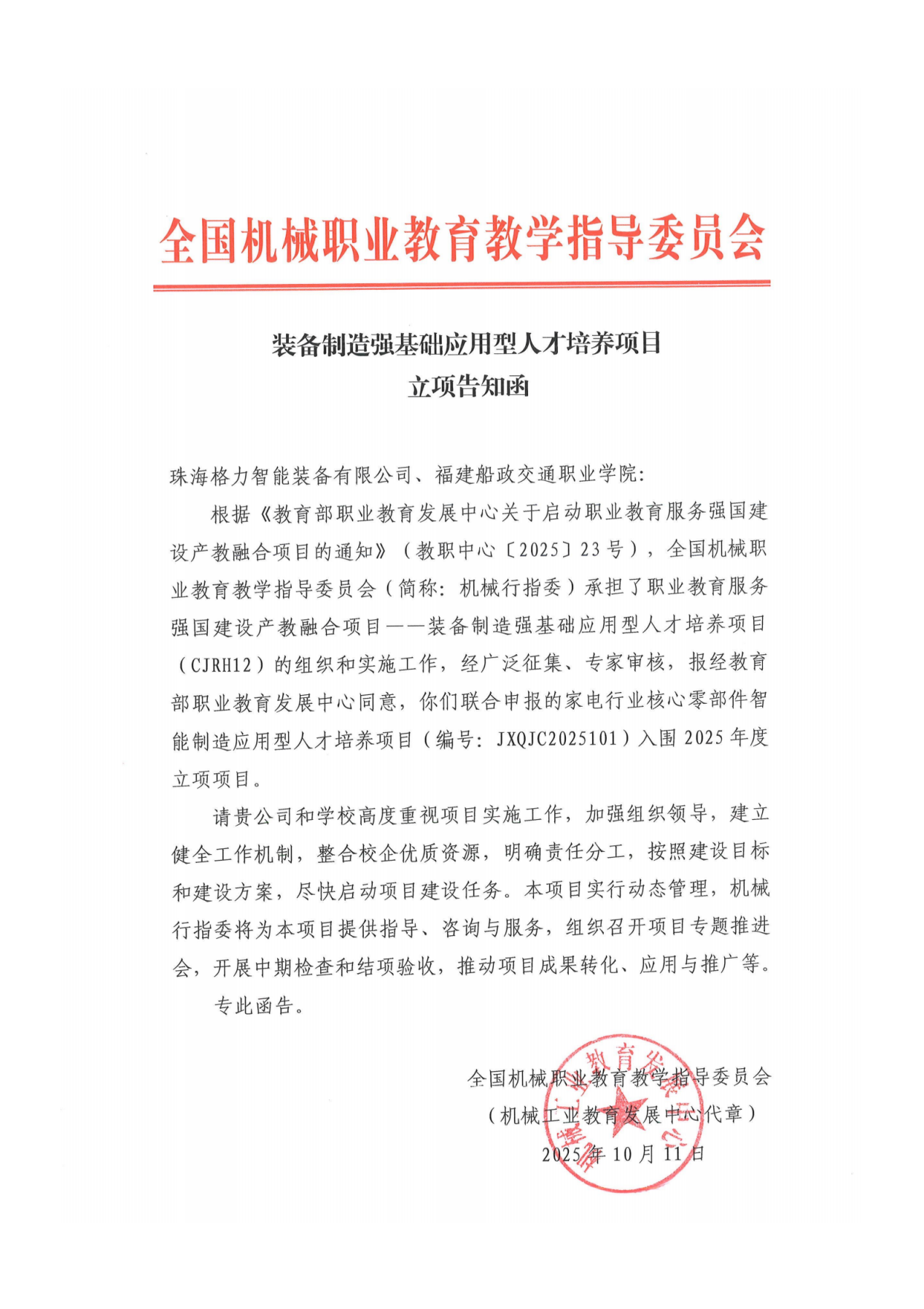 近日,全國機(jī)械職業(yè)教育教學(xué)指導(dǎo)委員會發(fā)布通知,我院聯(lián)合珠海格力智能裝備有限公司共同申報(bào)的“家電行業(yè)核心零部件智能制造應(yīng)用型人才培養(yǎng)項(xiàng)目”入選職業(yè)教育服務(wù)強(qiáng)國建設(shè)產(chǎn)教融合項(xiàng)目--裝備制造強(qiáng)基礎(chǔ)應(yīng)用型人才培養(yǎng)項(xiàng)目。