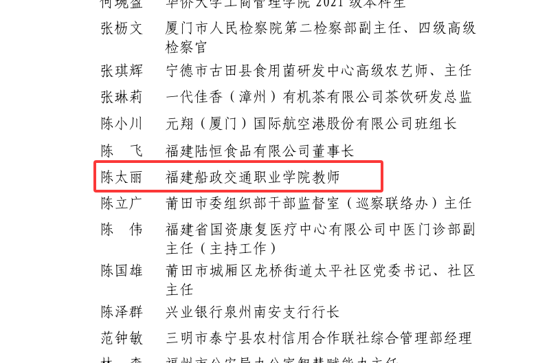 近日,共青團福建省委公示2025年度福建青年五四獎章、福建新時代青年先鋒、福建省五四紅旗團委(團支部)、福建省優(yōu)秀共青團員、福建省優(yōu)秀共青團干部表彰對象。我院教師陳太麗獲評“2025年度福建省新時代青年先鋒”榮譽稱號,特此祝賀!