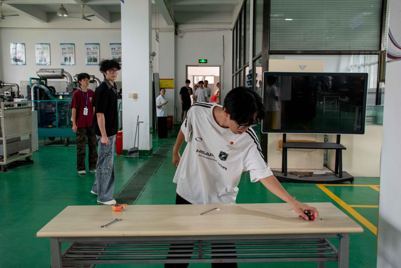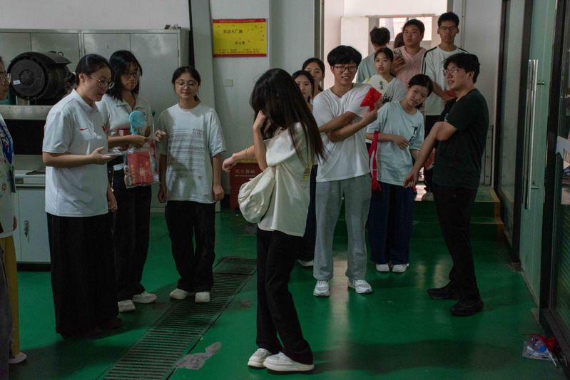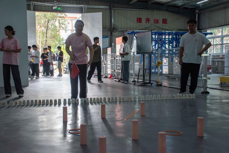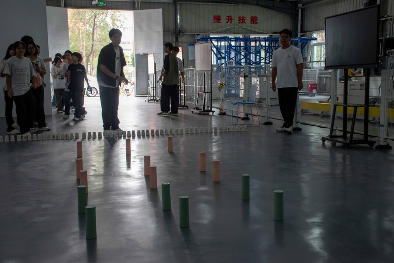 26號(hào)樓智能工程實(shí)訓(xùn)基地前,“找到真正的自己”挑戰(zhàn)現(xiàn)場(chǎng)人頭攢動(dòng)?!按笙蟊亲愚D(zhuǎn) 5 圈”——隨著口令響起,學(xué)子們手扶立柱,在旋轉(zhuǎn)中穩(wěn)住重心;眩暈感未消,便迅速?zèng)_向機(jī)械零件擺放區(qū),爭(zhēng)分奪秒完成任務(wù)。40秒的限時(shí)角逐里,有人踉蹌卻不放棄,有人敏捷又從容,緊張的氛圍中滿是青春的果敢。成功通關(guān)者接過(guò)“暖心寄語(yǔ)”,臉上的笑容里藏著突破自我的驕傲。這個(gè)看似簡(jiǎn)單的游戲,讓學(xué)子們?cè)谛D(zhuǎn)中解鎖潛藏的平衡力與專注力,每一圈轉(zhuǎn)動(dòng)都是與自我的對(duì)話,每一次成功都是成長(zhǎng)的勛章。