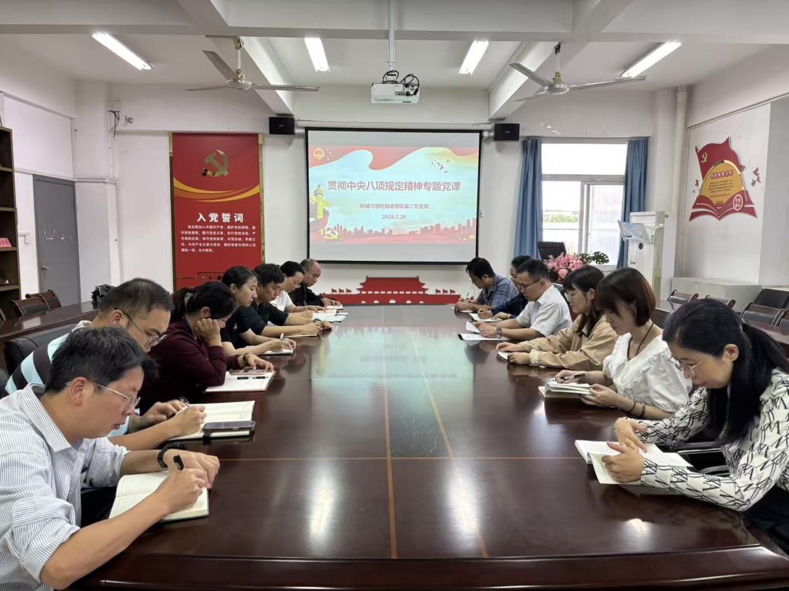 2025年5月29日,機(jī)械與智能制造學(xué)院第二黨支部開展貫徹落實(shí)中央八項(xiàng)規(guī)定精神專題宣講活動(dòng),引導(dǎo)支部教師黨員筑牢作風(fēng)建設(shè)思想防線,會(huì)議由支部書記楊開懷主持,全體教師黨員參加。