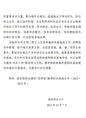 12月7日,教育部辦公廳公布國家級職業(yè)教育“雙師型”教師培訓(xùn)基地名單(2023-2025年),我校申報的交通運(yùn)輸大類道路運(yùn)輸中類“雙師型”教師培訓(xùn)基地成功入選國家級職業(yè)教育“雙師型”教師培訓(xùn)基地。