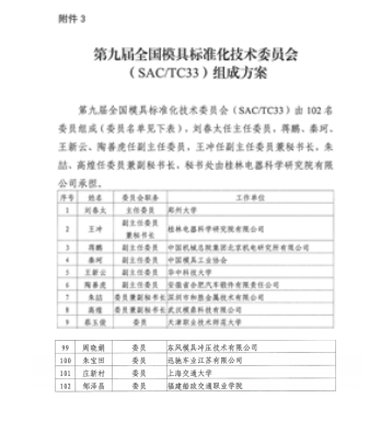 8月30日,國(guó)家標(biāo)準(zhǔn)化管理委員會(huì)公告(2023年第9號(hào))批準(zhǔn)了全國(guó)模具標(biāo)準(zhǔn)化技術(shù)委員會(huì)換屆。我院鄒澤昌老師入選第九屆全國(guó)模具標(biāo)準(zhǔn)化技術(shù)委員會(huì)(SAC/TC33)委員。全國(guó)模具標(biāo)準(zhǔn)化技術(shù)委員會(huì)是國(guó)家標(biāo)準(zhǔn)化管理委員會(huì)直屬的全國(guó)性標(biāo)準(zhǔn)化技術(shù)組織,成立于1983年,主要負(fù)責(zé)模具領(lǐng)域國(guó)家標(biāo)準(zhǔn)和行業(yè)標(biāo)準(zhǔn)的制修訂工作。