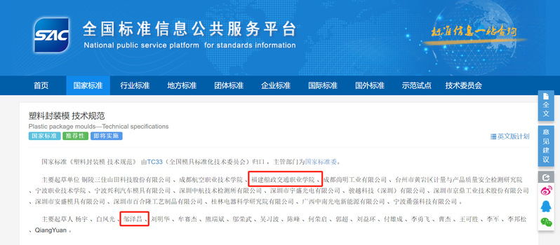 近日,國家市場監(jiān)督管理總局、國家標(biāo)準(zhǔn)化管理委員會發(fā)布中華人民共和國國家標(biāo)準(zhǔn)公告(2024年第22號),以我校作為第三起草單位、省級技能大師工作室領(lǐng)辦人鄒澤昌作為起草人的國家標(biāo)準(zhǔn)《塑料封裝模 技術(shù)規(guī)范》(GB/T 14663-2024)獲批發(fā)布,將于2025年4月1日開始實(shí)施。該標(biāo)準(zhǔn)是我校中國特色高水平高職學(xué)校建設(shè)的又一項(xiàng)重要成果。