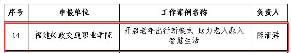 近日,福建省教育廳印發(fā)《關(guān)于公布2024年省級(jí)“智慧助老”優(yōu)質(zhì)工作案例和課程資源推介名單的通知》,本次推介名單共公布了20個(gè)優(yōu)質(zhì)工作案例及25門(mén)優(yōu)質(zhì)課程資源,我校《開(kāi)啟老年出行新模式 助力老人融入智慧生活》入選優(yōu)質(zhì)工作案例,《晚年出行新模式》入選優(yōu)質(zhì)課程資源。