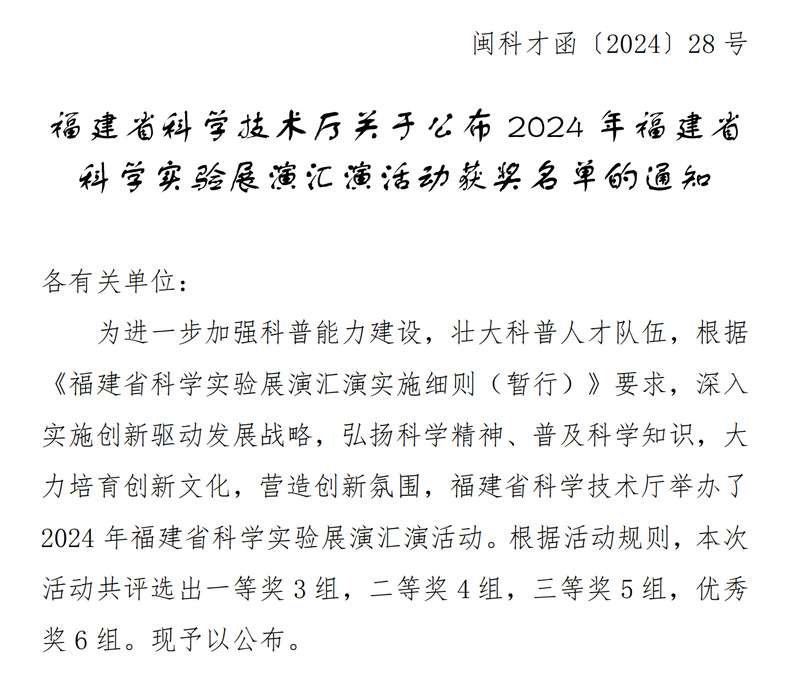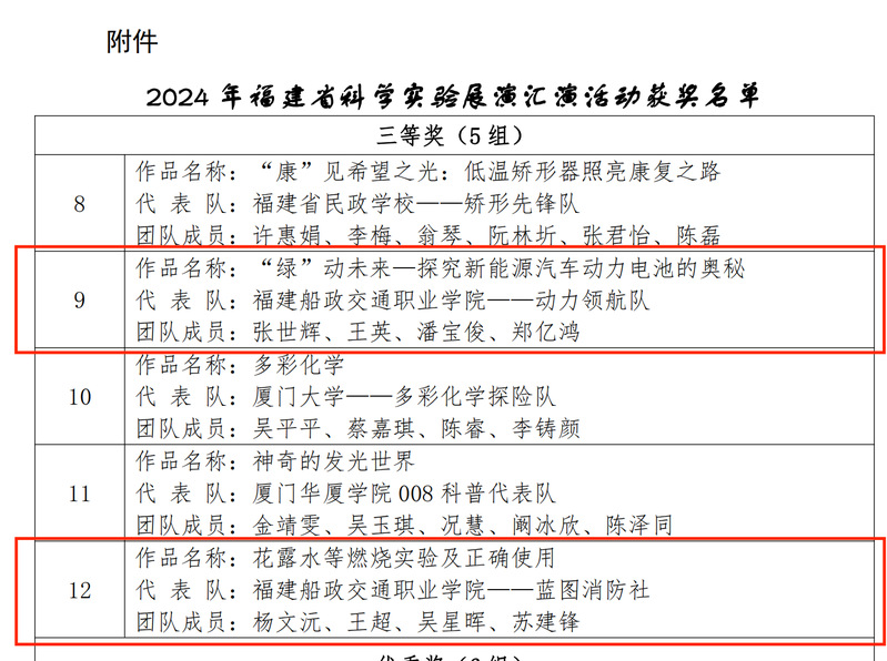近日,由福建省科學技術(shù)廳主辦的2024年福建省科學實驗展演匯演大賽在福州舉行,我院科技處選送的汽車學院作品“‘綠’動未來—探究新能源汽車動力電池的奧秘”科普實驗項目、安全與環(huán)境學院作品“花露水等燃燒實驗及正確使用”科普實驗項目榮獲三等獎。