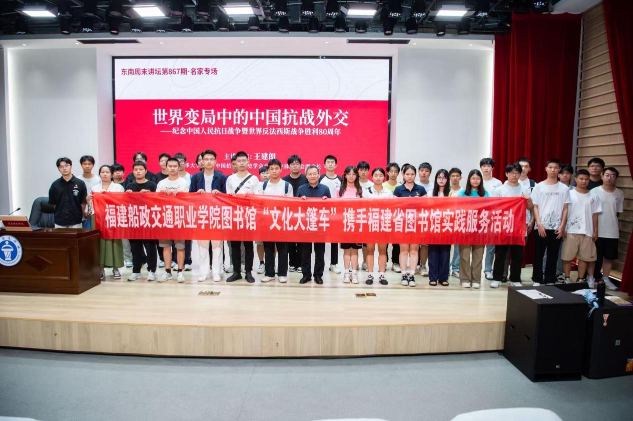 9月6日上午,我館“文化大篷車”團隊走進福建省圖書館,為“東南周末講壇”提供志愿服務(wù),志愿者協(xié)助完成講座接待、引賓導(dǎo)覽、資料發(fā)放等服務(wù),保障活動有序開展,并聆聽了清華大學(xué)教授、中國抗日戰(zhàn)爭史學(xué)會會長王建朗主講的《世界變局中的中國抗戰(zhàn)外交》講座。王教授以世界變局中的中國外交智慧為主線,剖析抗戰(zhàn)時期中國如何突破外交困局、爭取國際支持的歷史經(jīng)驗,強調(diào)抗戰(zhàn)精神對當代青年的啟示——銘記民族苦難輝煌,筑牢愛國信念根基。講座深化了學(xué)生對歷史縱深的理解,激發(fā)傳承紅色基因的行動自覺。
