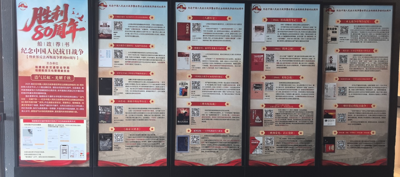 與此同時(shí),由我校圖書館策劃推出的“浩氣長虹?光耀千秋——紀(jì)念中國人民抗日戰(zhàn)爭暨世界反法西斯戰(zhàn)爭勝利80周年專題電子圖書展”在展廳門口同步展出。作為“文化大篷車”志愿服務(wù)活動(dòng)的重要組成部分,這一電子圖書展匯聚了涵蓋嚴(yán)謹(jǐn)學(xué)術(shù)著作、生動(dòng)紀(jì)實(shí)文學(xué)和感人紅色經(jīng)典等豐富多樣的系列作品。它借助現(xiàn)代科技的力量,為讀者搭建了一座通往歷史深處的橋梁,助力大家深入那段烽火歲月,感悟浩氣長存的民族精神,激發(fā)面向未來的磅礴力量。