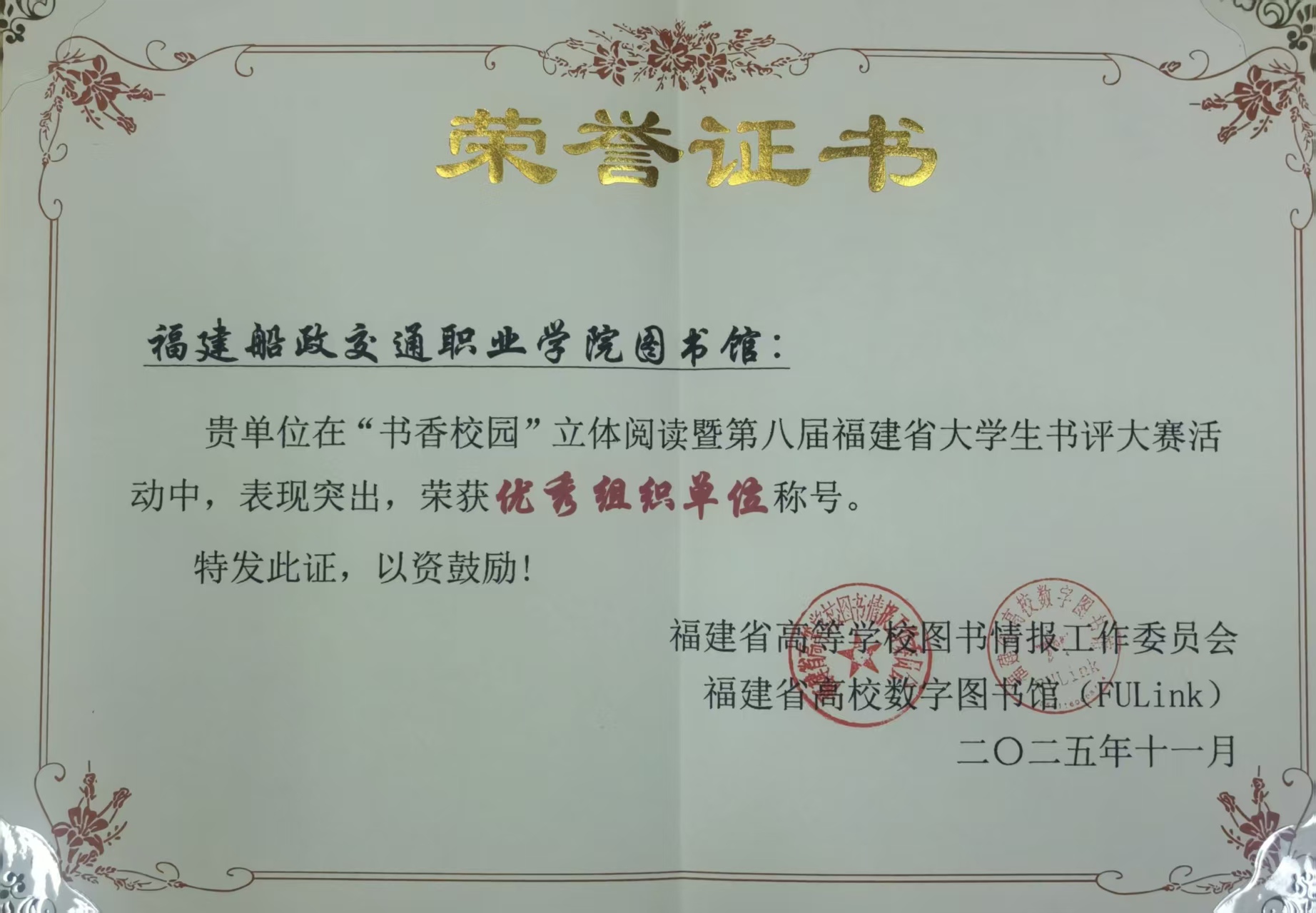 12月9日,福建省高等學(xué)校圖書(shū)情報(bào)工作委員會(huì)2025年學(xué)術(shù)年會(huì)在福州大學(xué)召開(kāi)。我校圖書(shū)館榮獲第六屆福建省高校“學(xué)問(wèn)杯”影評(píng)大賽、“書(shū)香校園”立體閱讀暨第八屆福建省大學(xué)生書(shū)評(píng)大賽等賽事優(yōu)秀組織獎(jiǎng),并獲評(píng)福建省高校圖書(shū)館2024-2025年度先進(jìn)集體榮譽(yù)稱(chēng)號(hào)。我校圖書(shū)館憑借扎實(shí)的工作成效,再次斬獲“福建省高校圖書(shū)館先進(jìn)集體”稱(chēng)號(hào),實(shí)現(xiàn)連續(xù)三年蟬聯(lián)此項(xiàng)榮譽(yù)。此次榮獲殊榮,不僅是省高校圖工委對(duì)我校圖書(shū)館工作的肯定,也是對(duì)推動(dòng)圖書(shū)館建設(shè)長(zhǎng)足發(fā)展的激勵(lì)和鞭策。