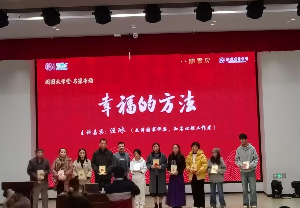 活動現(xiàn)場志愿者擔任會場引導(dǎo)員,保障講座秩序井然,并聆聽了閩圖大學(xué)堂·名家舉辦的《幸福的方法》講座。講座中,專家從積極心理學(xué)視角出發(fā),生動闡述幸福的內(nèi)涵與實踐途徑。互動環(huán)節(jié)氣氛熱烈,兩位幸運同學(xué)在抽獎中獲得贈書。大家紛紛表示,這場講座不僅啟發(fā)了他們對個人幸福的思考,更讓他們深刻體會到,在奉獻社會、服務(wù)他人的實踐中,自身所獲得的成長與滿足感,正是幸福的重要源泉。