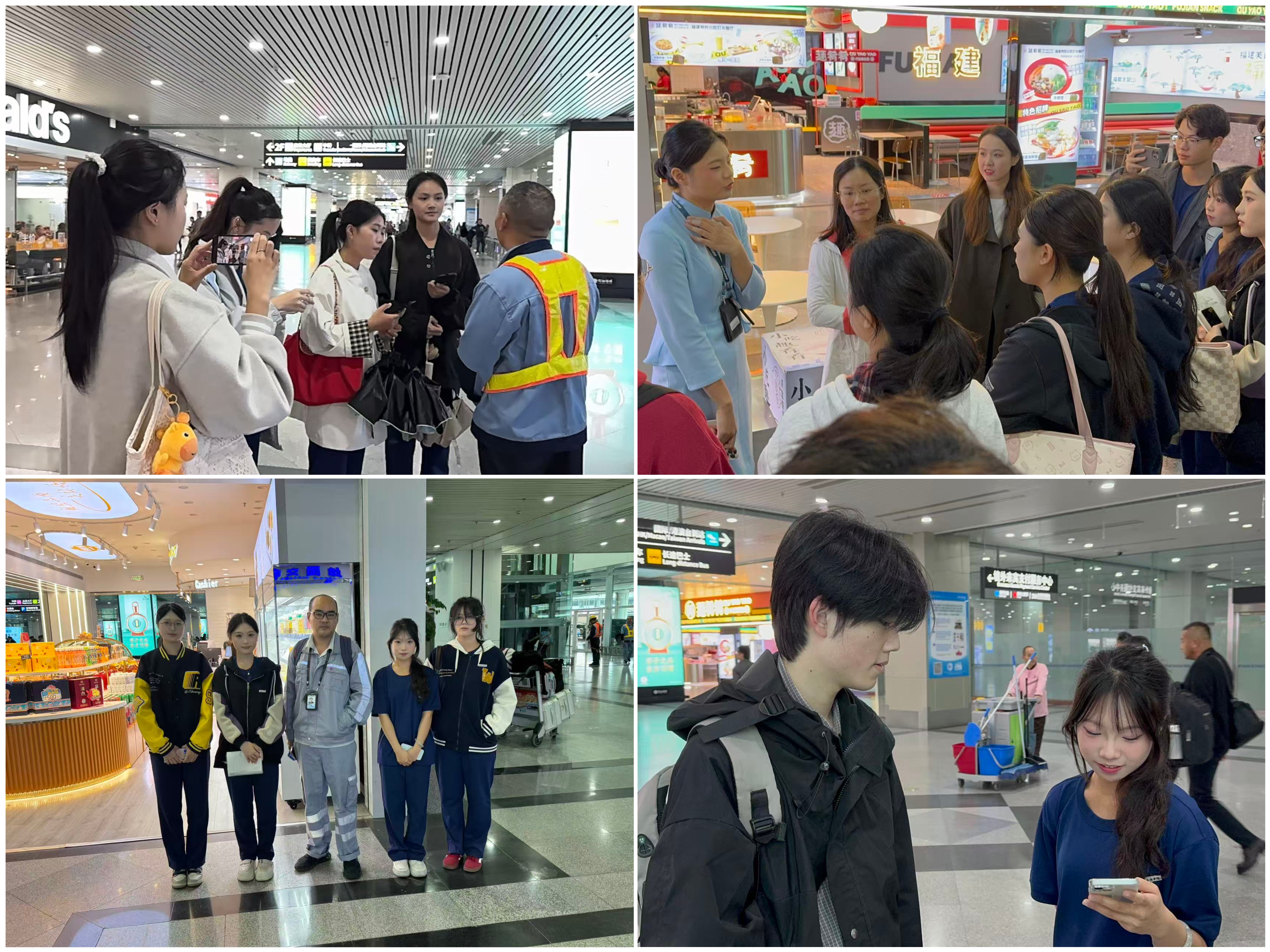 在 9:30 至 10:30 的現(xiàn)場(chǎng)觀察環(huán)節(jié),各小組在值機(jī)島、問詢臺(tái)、安檢入口等指定區(qū)域,細(xì)致記錄旅客流動(dòng)路線、服務(wù)設(shè)施布局及一線員工工作狀態(tài),直觀感受機(jī)場(chǎng)運(yùn)作的有序高效。隨后的訪談?wù){(diào)研中,同學(xué)們鼓足勇氣,禮貌征得受訪者同意后,分別對(duì)不同背景的旅客和機(jī)場(chǎng)員工展開交流。面對(duì)旅客,他們圍繞出行體驗(yàn)、設(shè)施使用感受及對(duì)空乘人員的期望等問題虛心請(qǐng)教;遇到問詢員、值機(jī)員等在崗員工時(shí),則重點(diǎn)了解崗位職責(zé)、職業(yè)素養(yǎng)要求及應(yīng)急處置技巧,部分小組還在同意前提下進(jìn)行了視頻記錄。