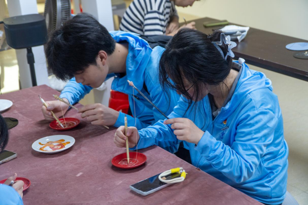 三下鄉(xiāng)隊伍駐足漆線雕傳承工作室,推開工作室的門,便置身于大漆與歲月交織的藝術空間。漆線雕作為閩南傳統(tǒng)工藝,將天然大漆與陳年磚粉經(jīng)反復舂搗調(diào)和,制成柔韌的 “漆線土”。匠人憑借嫻熟技法,在素白瓷坯上盤繞出纏枝蓮紋、祥云朵朵等立體紋樣,再施以金箔、彩料裝飾,最終呈現(xiàn)出精美的漆線雕作品。其色彩與紋樣承載著閩南地區(qū)的民俗信仰與生活風情,是地域文化的生動寫照。成員們親手嘗試盤制簡單圖案,通過指尖觸感,切實體會到這門千年技藝的深厚底蘊與獨特魅力。