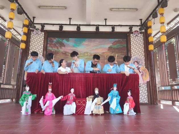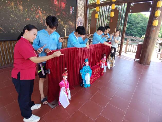 暮色之中,傳承團前往木偶戲戲臺學習提線木偶。在觀看了一場精彩的《拜壽》戲曲后,成員們躍躍欲試,開始對提線木偶技藝進行初步嘗試。細繩纏繞指尖,輕拉慢放間,木偶仿佛被注入了生命,輕輕顫動。成員們?nèi)褙炞?,一絲不茍地模仿師傅的動作,盡管手法尚顯生疏,卻難掩對這門古老藝術的敬畏與熱愛。在這靜謐與靈動交織的瞬間,傳統(tǒng)技藝的種子悄然播撒心田,激發(fā)起成員們傳承與創(chuàng)新的責任感。