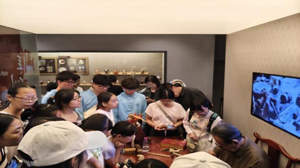 成員們圍攏在木偶工作臺旁,老匠人的刻刀起落間,木屑紛飛,他們從中感知木偶頭“三分面七分神”的奧秘。展柜里,閩南民居模型的榫卯結(jié)構(gòu)吸引著傳承團成員,他們反復端詳。聆聽非遺故事,觸摸技藝溫度,傳承團心中滿是對閩藝的震撼與傳承熱忱。