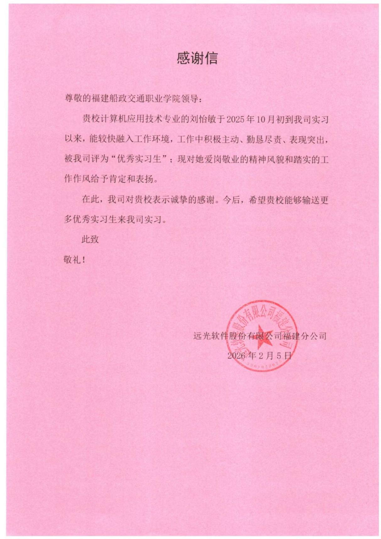 近日,遠(yuǎn)光軟件股份有限公司福建分公司向?qū)W院發(fā)來(lái)感謝信,對(duì)我院計(jì)算機(jī)應(yīng)用技術(shù)專業(yè)劉怡敏同學(xué)在實(shí)習(xí)期間的優(yōu)異表現(xiàn)給予高度肯定,并對(duì)學(xué)院人才培養(yǎng)質(zhì)量表示認(rèn)可。