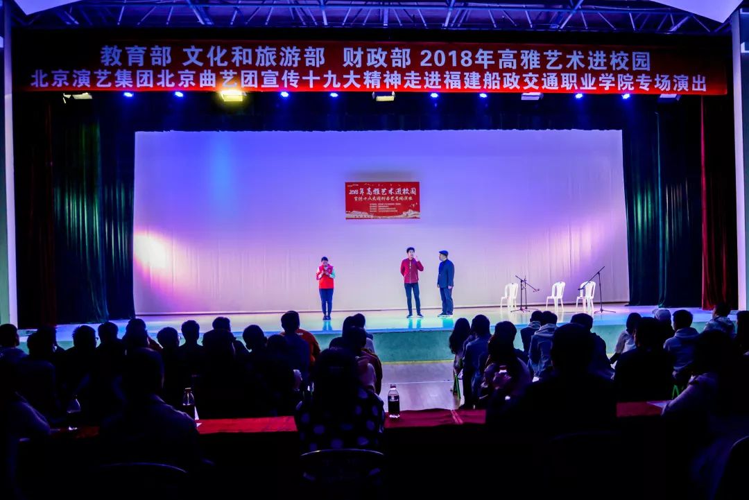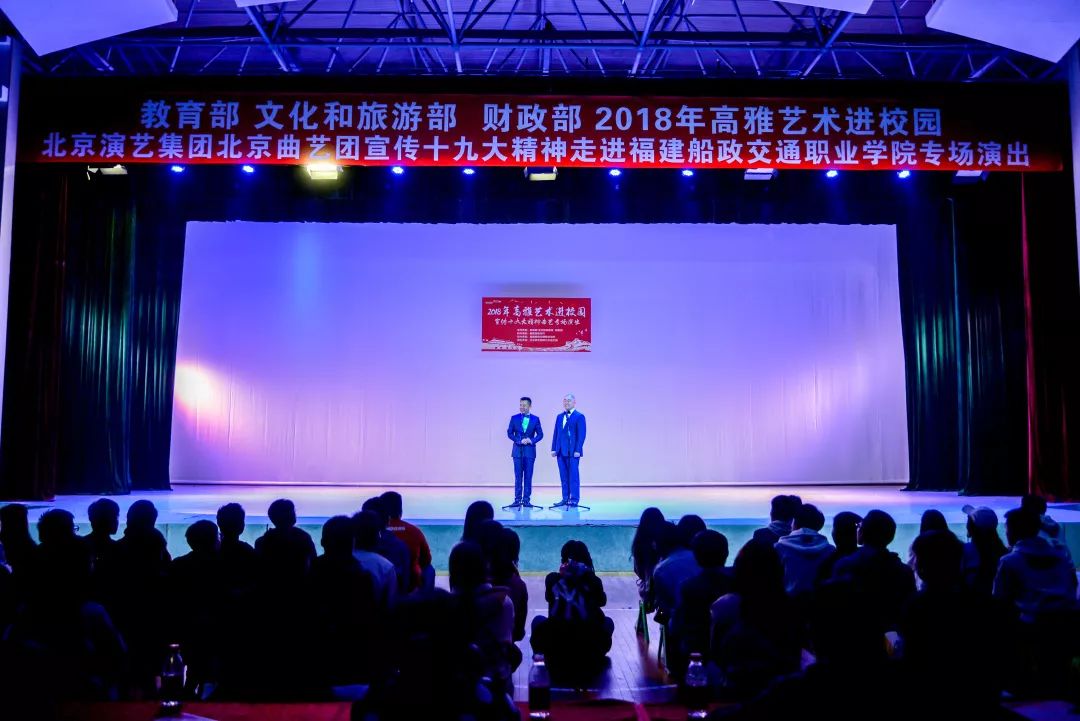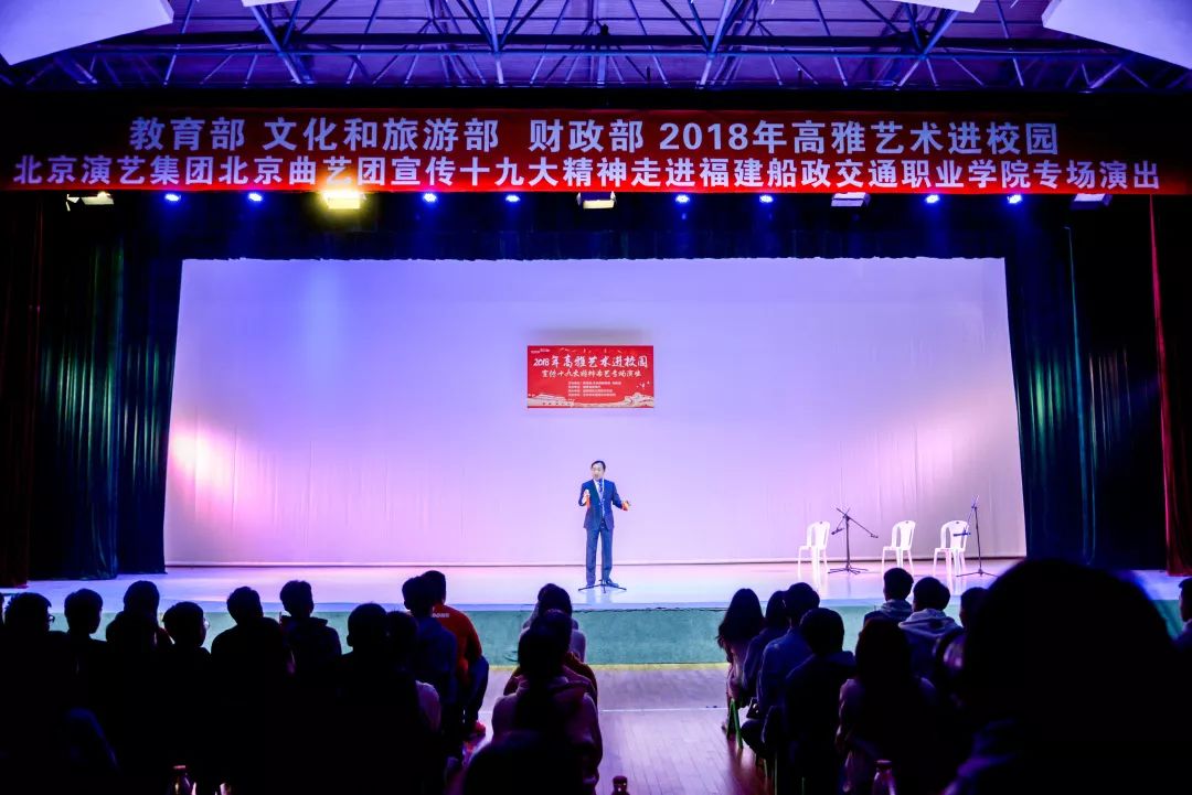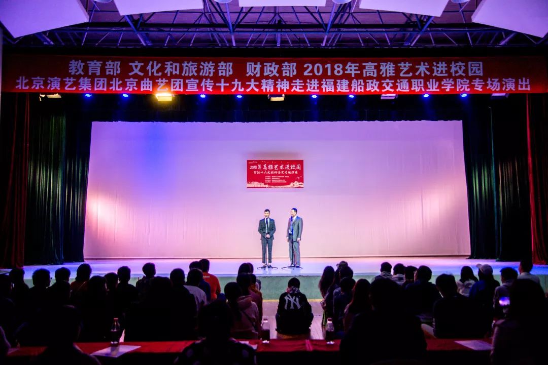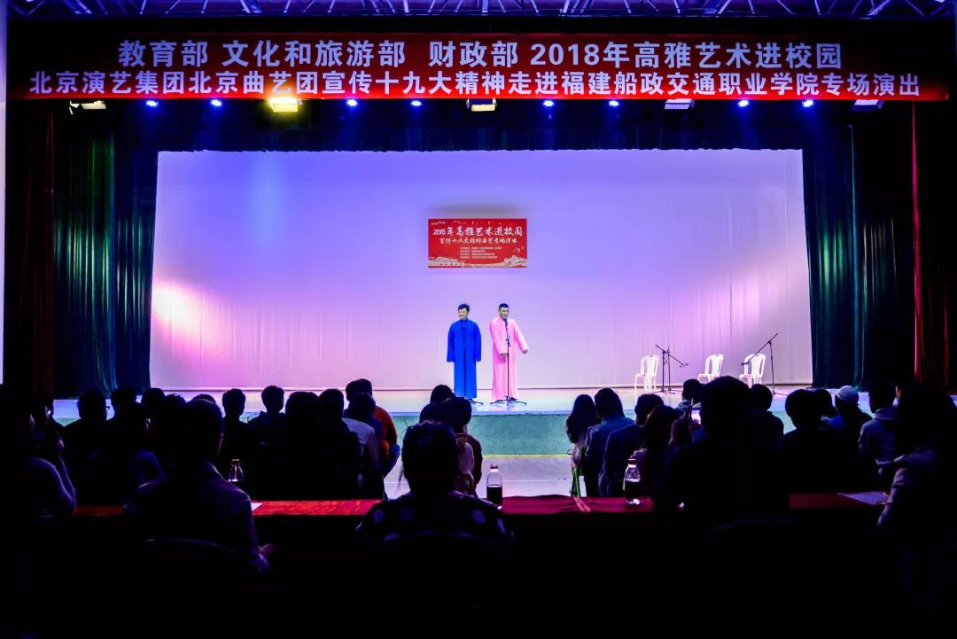 為深入學(xué)習(xí)貫徹黨的十九大精神,積極主動(dòng)投身習(xí)近平新時(shí)代中國(guó)特色社會(huì)主義思想“大學(xué)習(xí)”熱潮中,11月22日,由教育部、文化旅游部和財(cái)政部三部委聯(lián)合舉辦,福建船政交通職業(yè)學(xué)院承辦的“高雅藝術(shù)進(jìn)校園——北京演藝集團(tuán)北京曲藝園走進(jìn)船政校園專場(chǎng)”在我校文體活動(dòng)中心舉行。