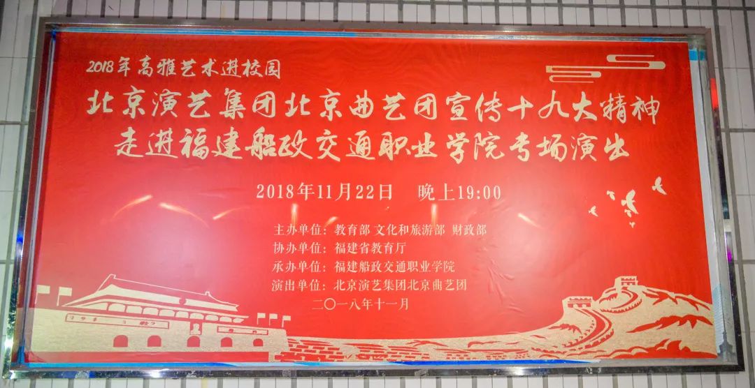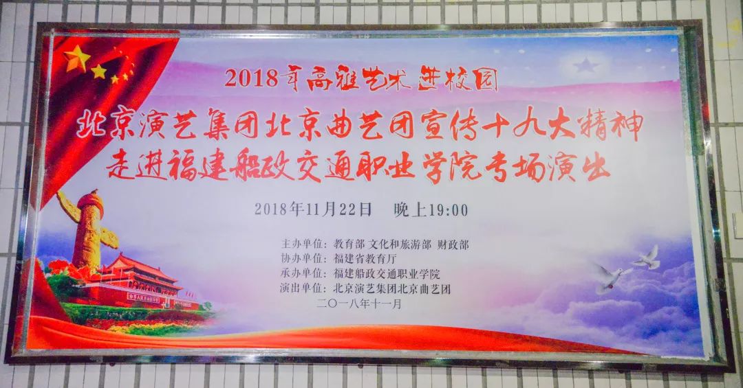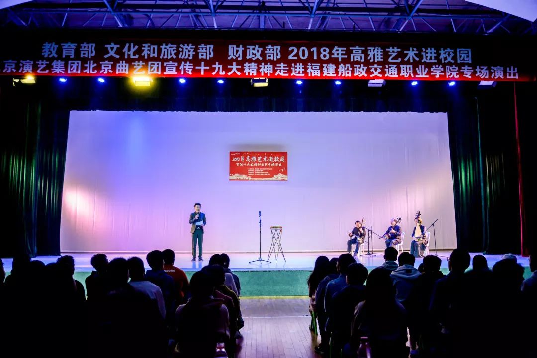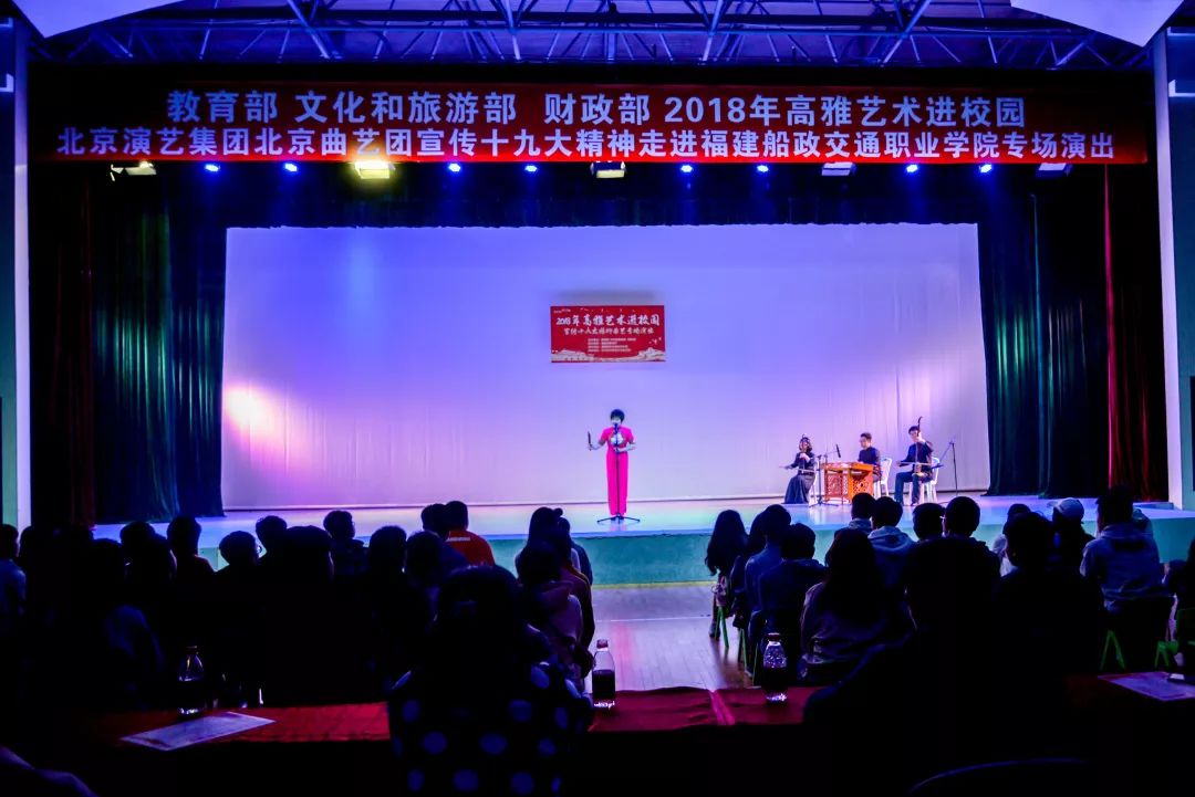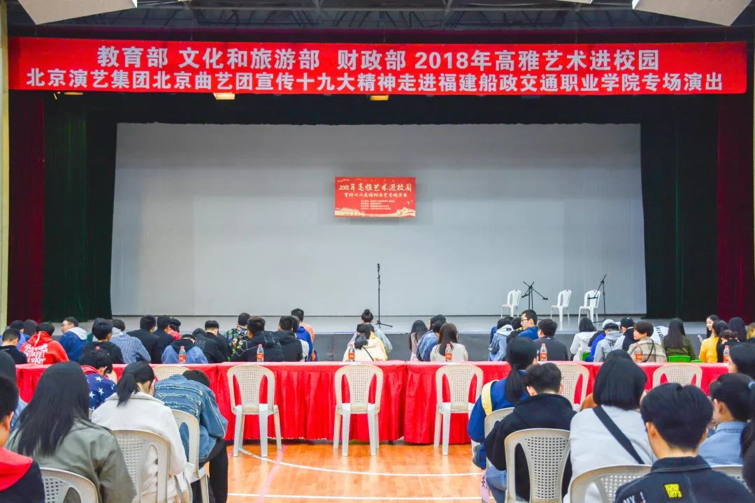 為深入學(xué)習(xí)貫徹黨的十九大精神,積極主動(dòng)投身習(xí)近平新時(shí)代中國(guó)特色社會(huì)主義思想“大學(xué)習(xí)”熱潮中,11月22日,由教育部、文化旅游部和財(cái)政部三部委聯(lián)合舉辦,福建船政交通職業(yè)學(xué)院承辦的“高雅藝術(shù)進(jìn)校園——北京演藝集團(tuán)北京曲藝園走進(jìn)船政校園專場(chǎng)”在我校文體活動(dòng)中心舉行。