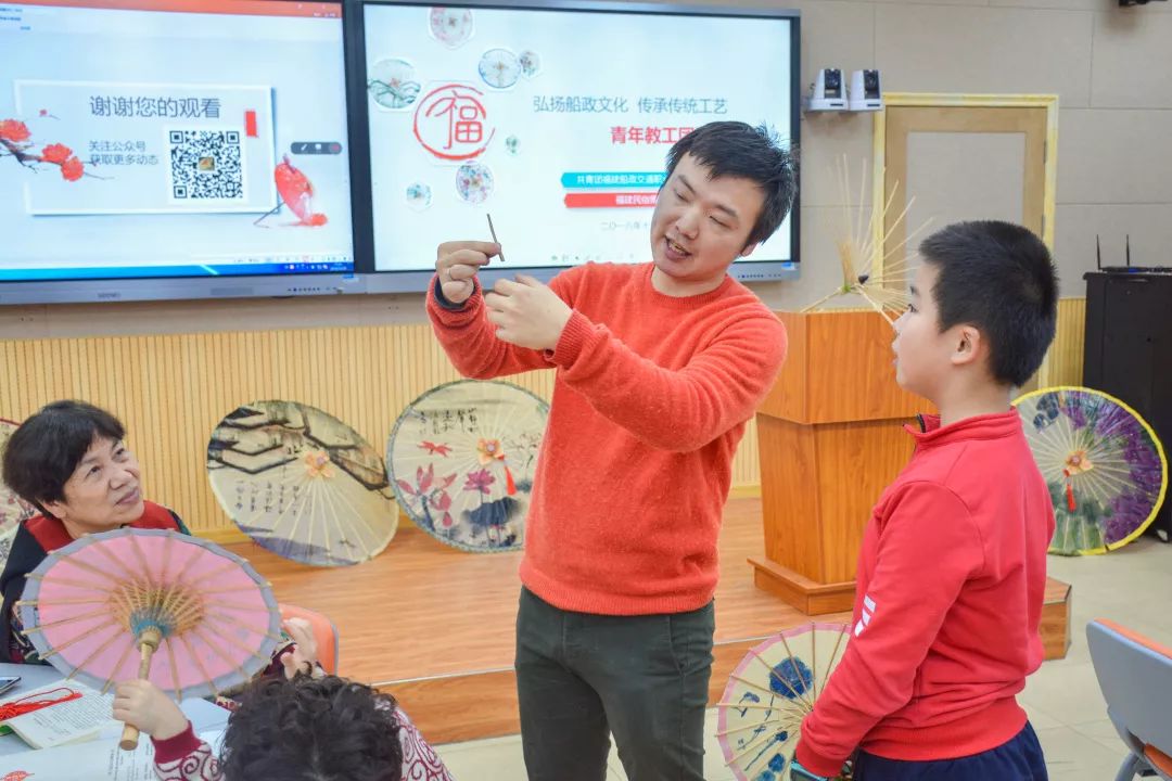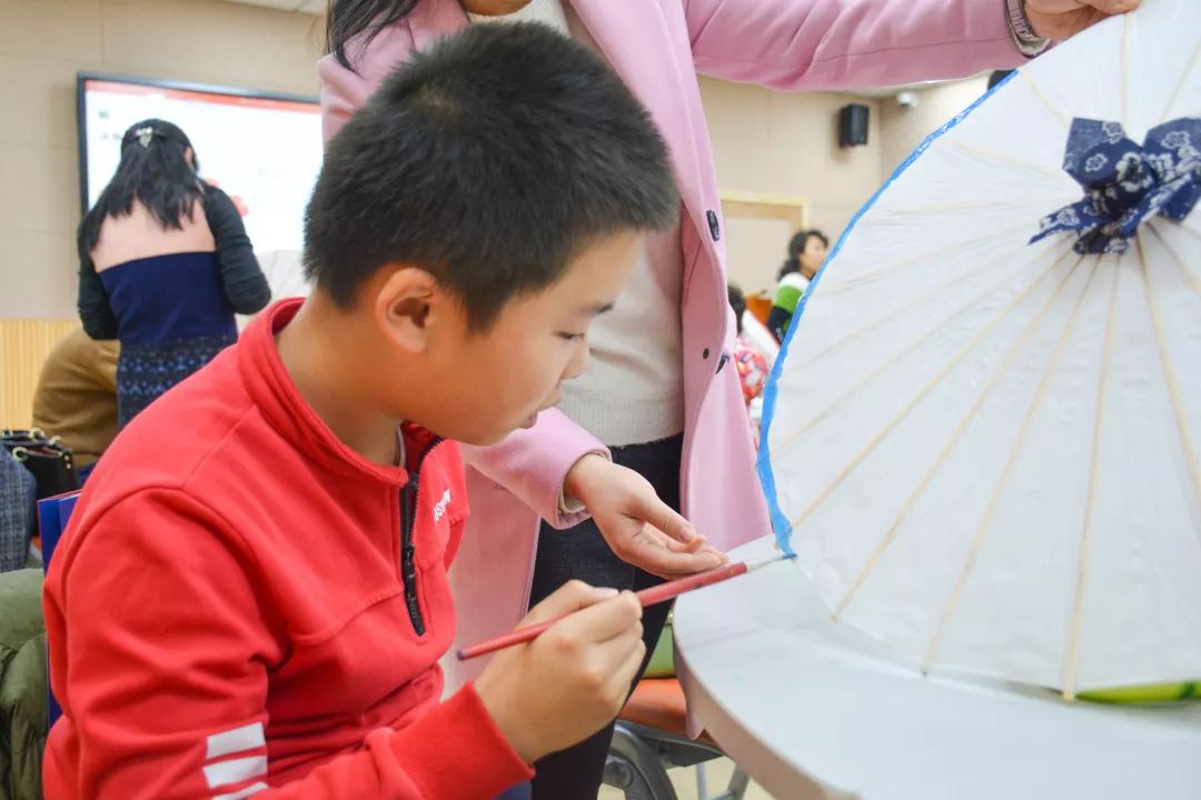 青年教工和孩子們一起制作油紙傘