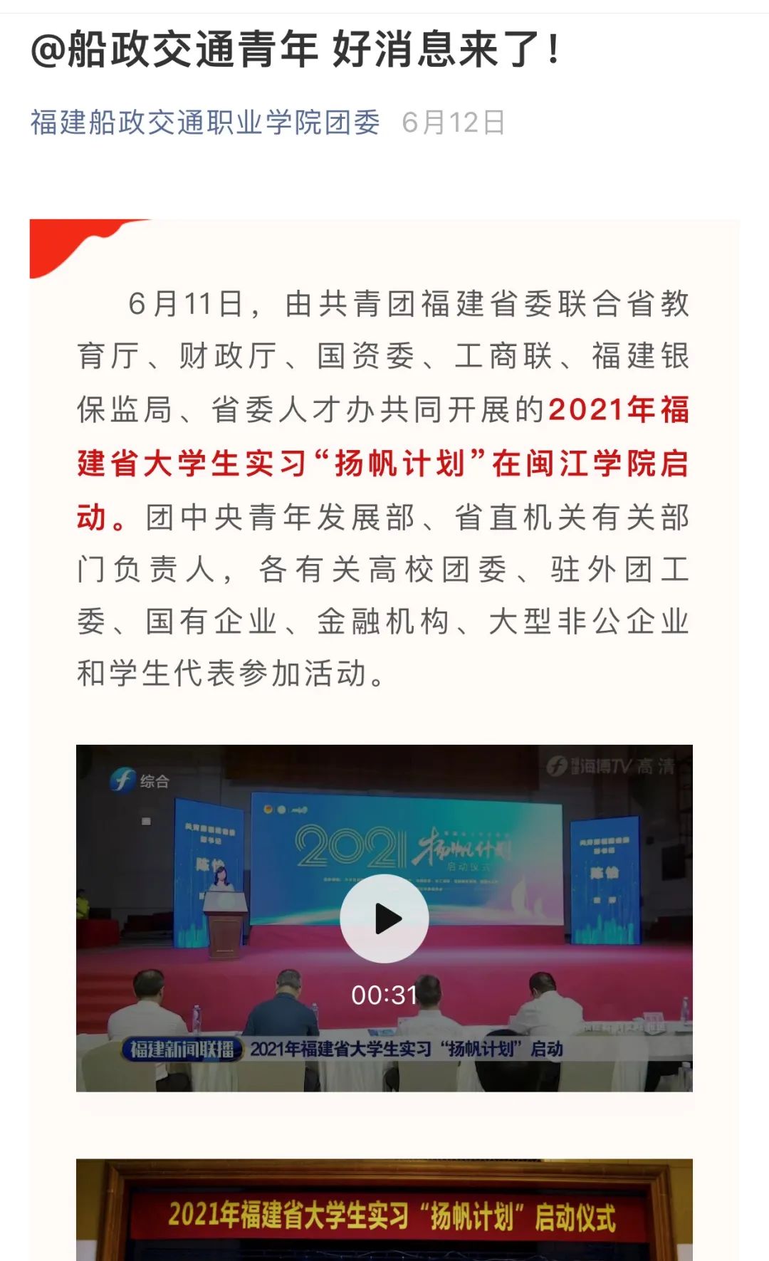 2021年福建省大學(xué)生實(shí)習(xí)“揚(yáng)帆計(jì)劃”已正式啟動(dòng),首批7257個(gè)實(shí)習(xí)崗位發(fā)布,現(xiàn)已進(jìn)入火熱報(bào)名階段,為切實(shí)幫助船政交通學(xué)子認(rèn)識(shí)、了解、參與“揚(yáng)帆計(jì)劃”,準(zhǔn)確定位自己喜歡的實(shí)習(xí)崗位,在社會(huì)實(shí)踐中開(kāi)拓視野,提升自我,校學(xué)生會(huì)及時(shí)推送和轉(zhuǎn)發(fā)大學(xué)生實(shí)習(xí)“揚(yáng)帆計(jì)劃”相關(guān)報(bào)道,傳遞最新最快崗位信息。