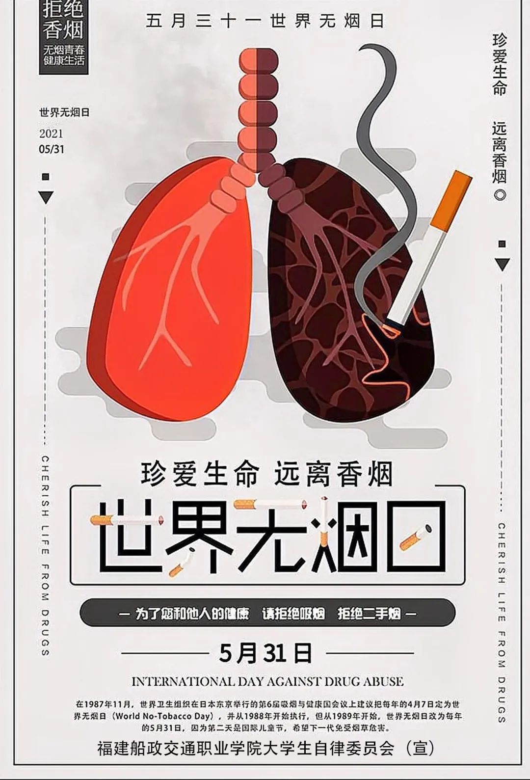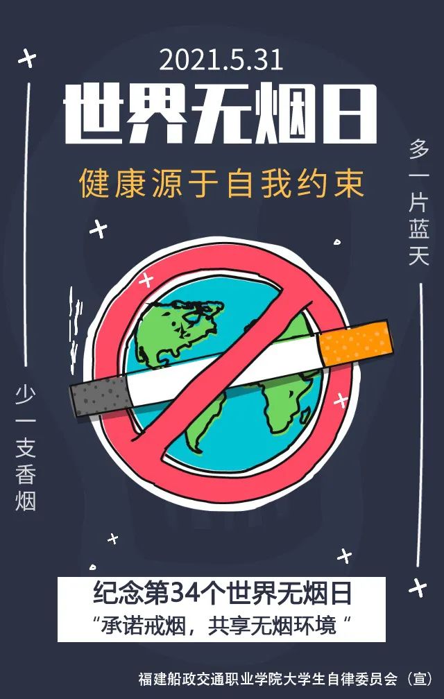 為推動黨史學(xué)習(xí)教育深入開展,將學(xué)習(xí)成果轉(zhuǎn)化為辦實(shí)事、開新局的實(shí)際行動,動員更多師生參與和支持校園無煙事業(yè),以優(yōu)異成績慶祝中國共產(chǎn)黨成立100周年,在世界第34個(gè)世界無煙日到來之際,校大學(xué)生自律委員會舉辦“承諾戒煙 共享無煙環(huán)境”世界無煙日校園系列活動。
