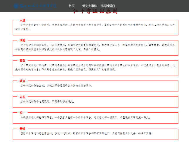 通過對黨史的學(xué)習(xí),我們更好的了解過去,以革命先輩的崇高精神為追求,我校紅十字會學(xué)生分會于5月1日-10日開展“學(xué)史崇德,博愛載物”網(wǎng)頁設(shè)計比賽,本次活動共收到船政學(xué)子投稿作品40份。有力推動學(xué)習(xí)黨史氛圍,在踐行社會主義核心價值觀中,弘揚“人道、博愛、奉獻”的紅十字精神。