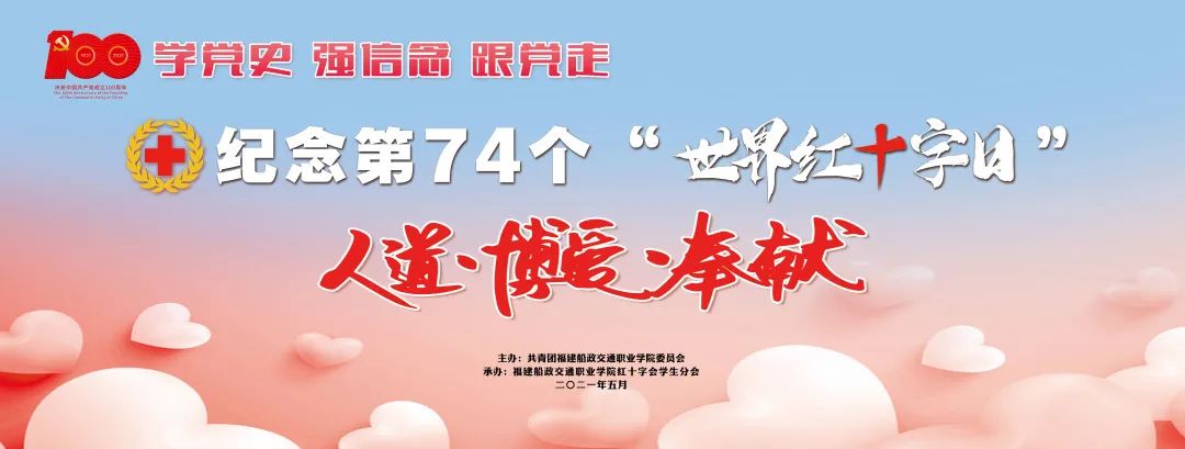 2021年5月8日是第74個“世界紅十字日”,為推動黨史學(xué)習(xí)教育深入開展,大力營造良好輿論環(huán)境,動員更多社會力量參與和支持紅十字事業(yè),以優(yōu)異成績慶祝中國共產(chǎn)黨成立100周年,提高全校師生社會責(zé)任感和使命感,營造健康良好的校園生活環(huán)境,福建船政交通職業(yè)學(xué)院紅十字會學(xué)生分會在學(xué)校黨委領(lǐng)導(dǎo)和團委指導(dǎo)下,組織開展2021年第74個“世界紅十字日”主題系列活動。此次活動包括線上知識答題、志愿者培訓(xùn)、紅十字日校園活動、青春健康教育學(xué)習(xí)培訓(xùn)會、女性健康知識講座、防震減災(zāi)逃生演練、海報設(shè)計、急救知識進社區(qū)、暖心抒寫送祝福、網(wǎng)頁設(shè)計比賽、鴻儒養(yǎng)老樂園志愿服務(wù)等十二項活動。