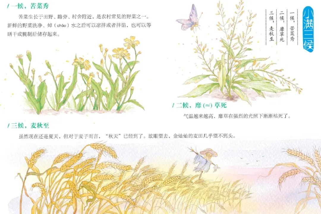 小滿節(jié)氣后,苦菜已經枝葉繁茂;之后,喜陰的一些枝條細軟的草類在強烈的陽光下開始枯死;在小滿的最后一個時段,麥子開始成熟。雖然時間還是夏季,但對麥子來說,卻到了成熟的“秋”。