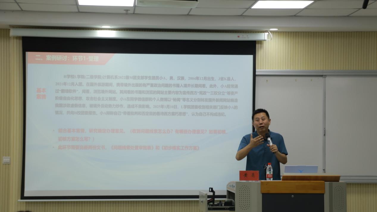 最后一講,是中央團(tuán)校黃亮老師帶來的《團(tuán)紀(jì)執(zhí)行案例教學(xué)》。課程通過聚焦團(tuán)紀(jì)執(zhí)行核心,明確縣級及以上團(tuán)的委員會組織部門等執(zhí)紀(jì)權(quán)限,詳解從受理到處分執(zhí)行的5個關(guān)鍵步驟,全程強(qiáng)調(diào)集體研究的重要性;并通過現(xiàn)場模擬案例,切實提升教師團(tuán)干依規(guī)執(zhí)紀(jì)能力,為團(tuán)務(wù)工作開展和青年學(xué)生行為規(guī)范提供清晰遵循。