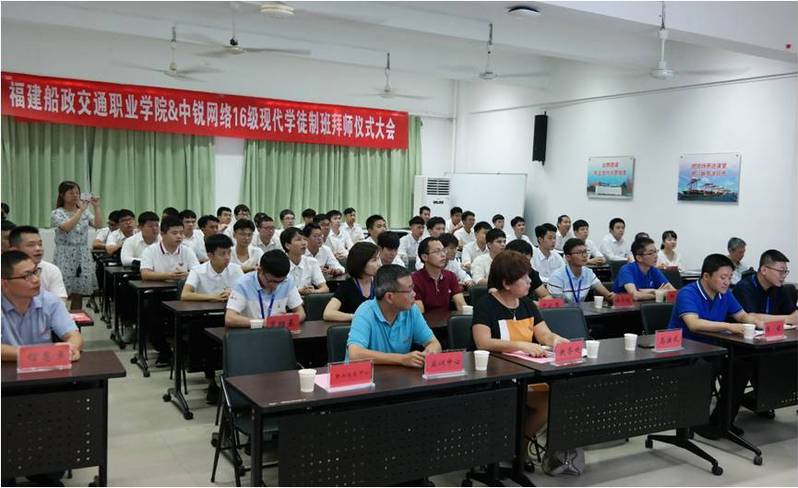 9月26日,福建船政交通職業(yè)學(xué)院信息工程系2016級(jí)計(jì)算機(jī)網(wǎng)絡(luò)技術(shù)專業(yè)現(xiàn)代學(xué)徒制試點(diǎn)班學(xué)生拜師儀式在2號(hào)樓舉行。學(xué)院副院長(zhǎng)高汝武教授,福建中銳網(wǎng)絡(luò)股份有限公司副總裁陳銘,校企相關(guān)部門負(fù)責(zé)人,信息系計(jì)算機(jī)網(wǎng)絡(luò)技術(shù)專業(yè)教研室全體教師,學(xué)徒制試點(diǎn)班全體導(dǎo)師、學(xué)生參加了儀式。